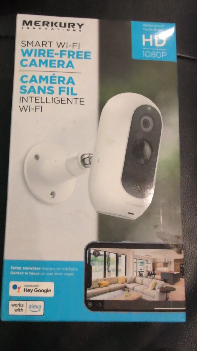 Selling a Merkury Innovations smart Wi-Fi wire-free camera. It's waterproof and records in HD 1080p. You can set it up anywhere, indoors or outdoors! It also works with Hey Google and Alexa.