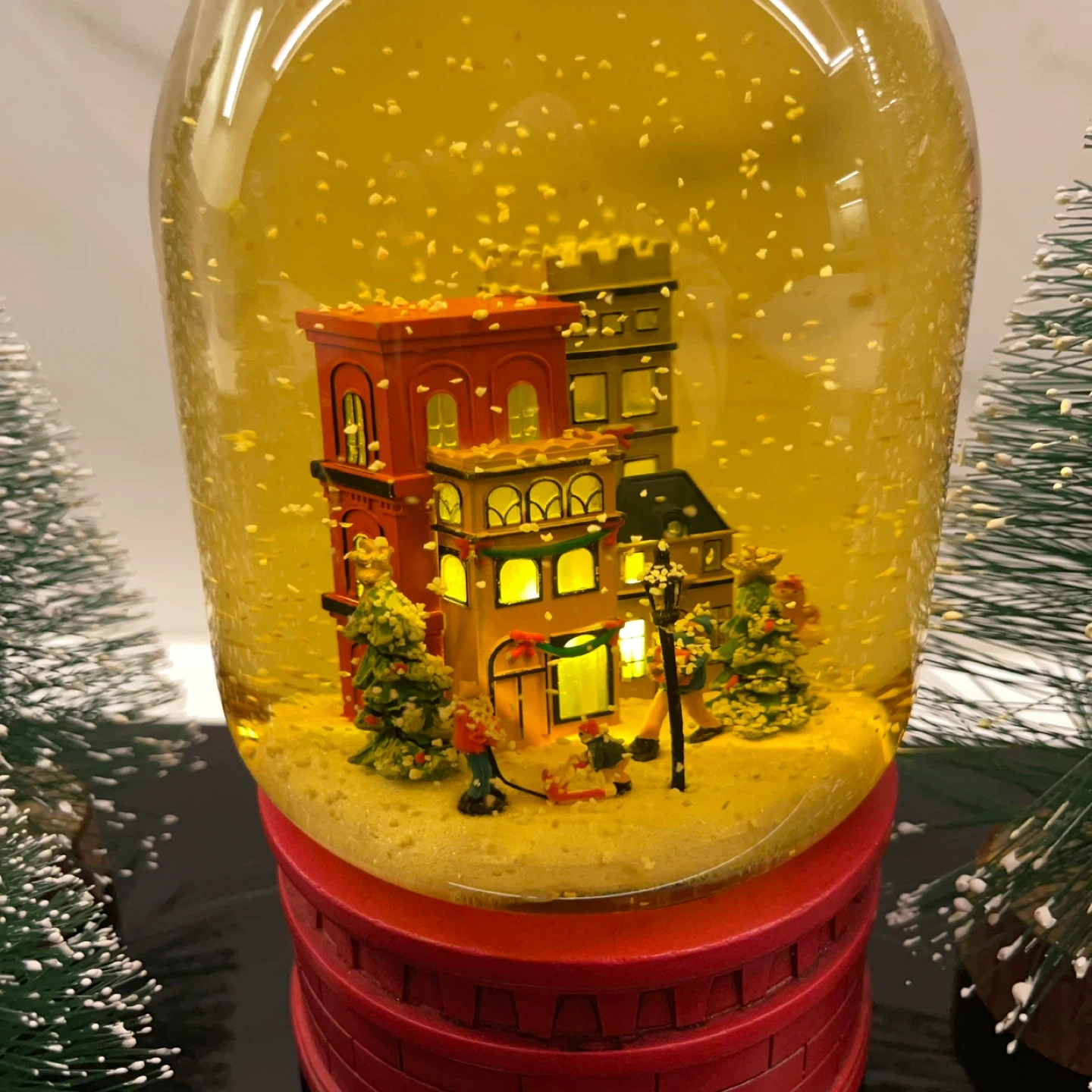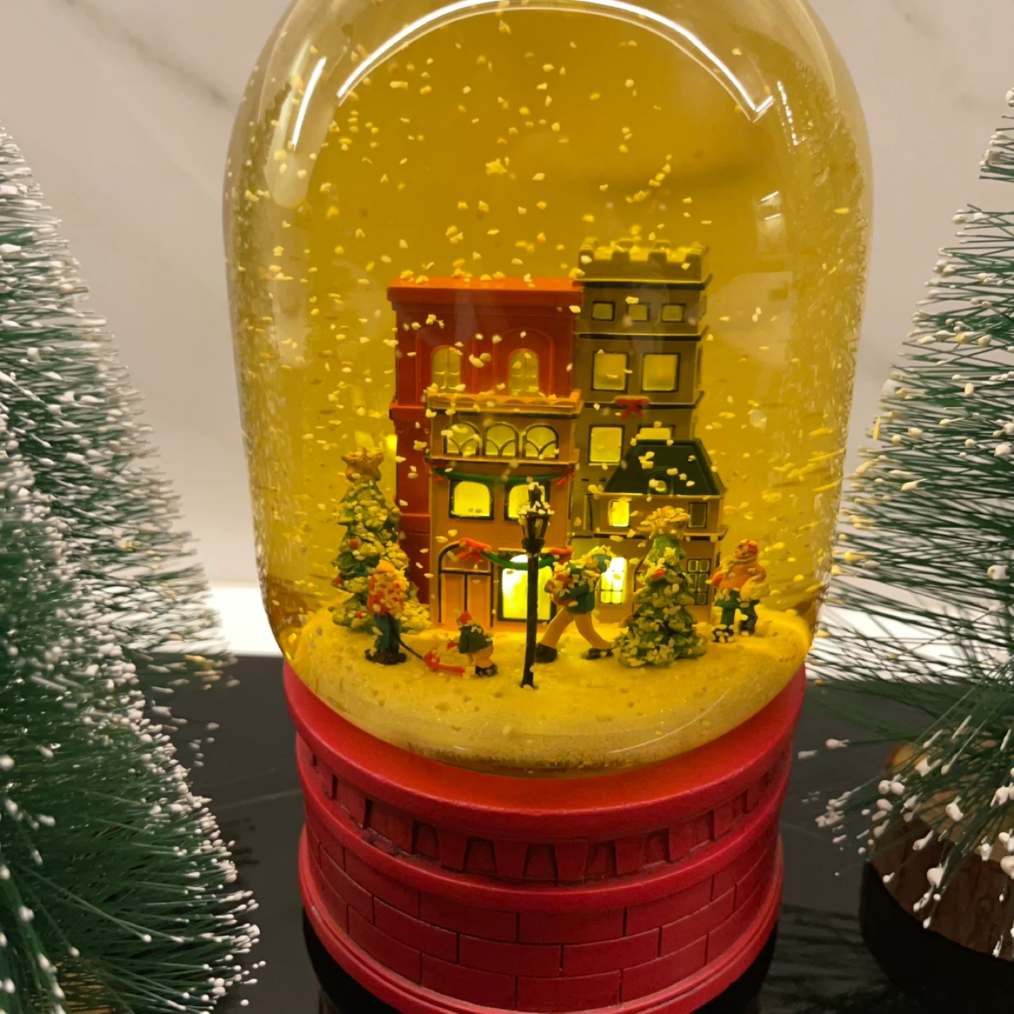 Christmas holiday snow globe on a red brick-style base with yellow sepia tinted glass showing a quaint winter town scene with illuminated buildings, snowy trees, a lamppost, and miniature figures.