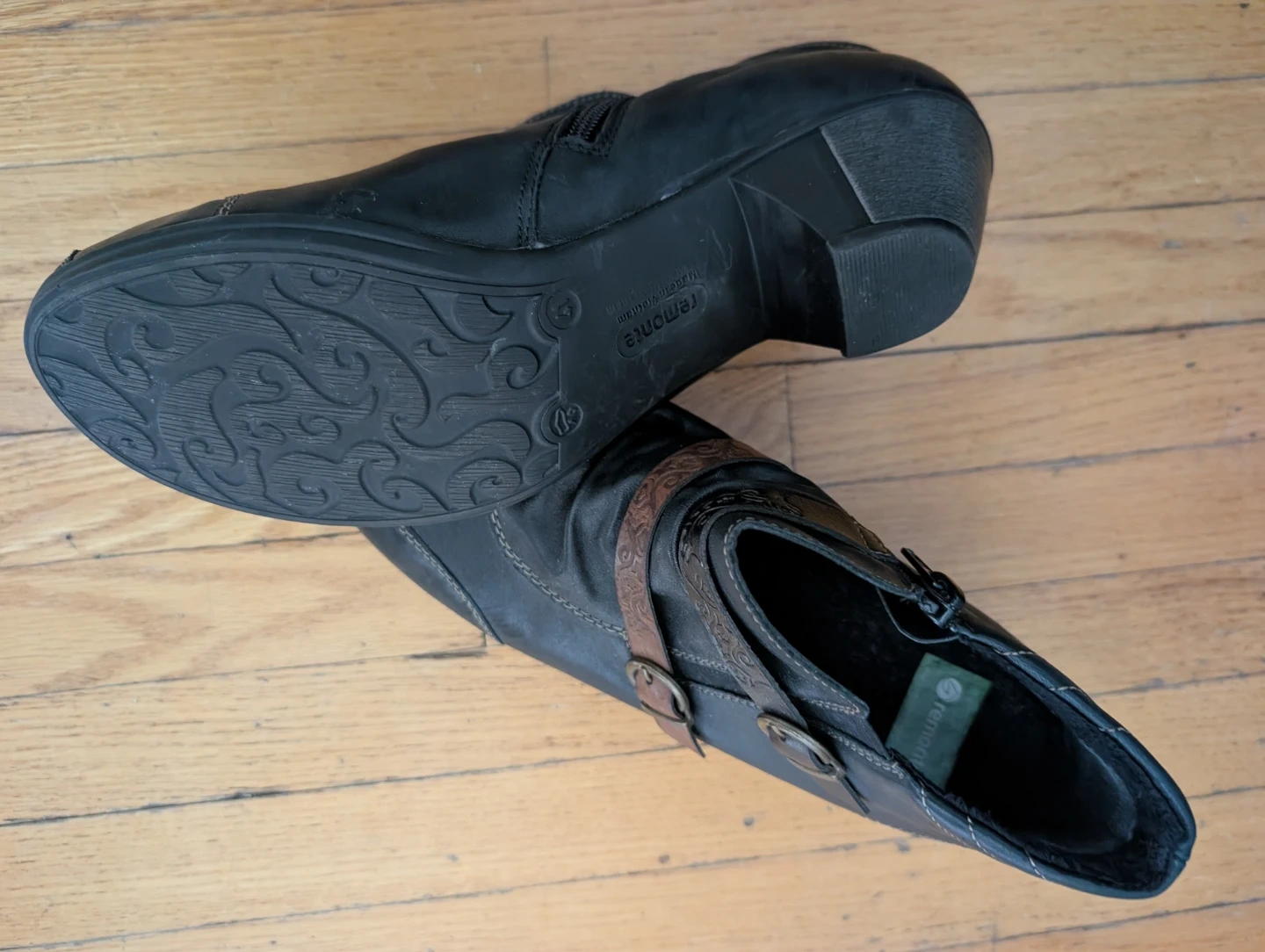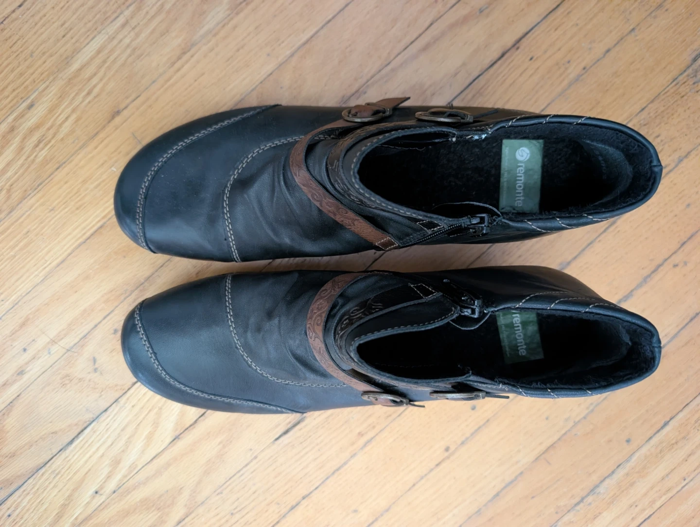 Excellent quality Remonte black leather ankle boots. European size 41. These are the cutest boots! I don't think I even got to wear them outside before my foot changed. Features decorative straps with buckles and a side zipper for easy on and off. Adds such style to everyday jeans!