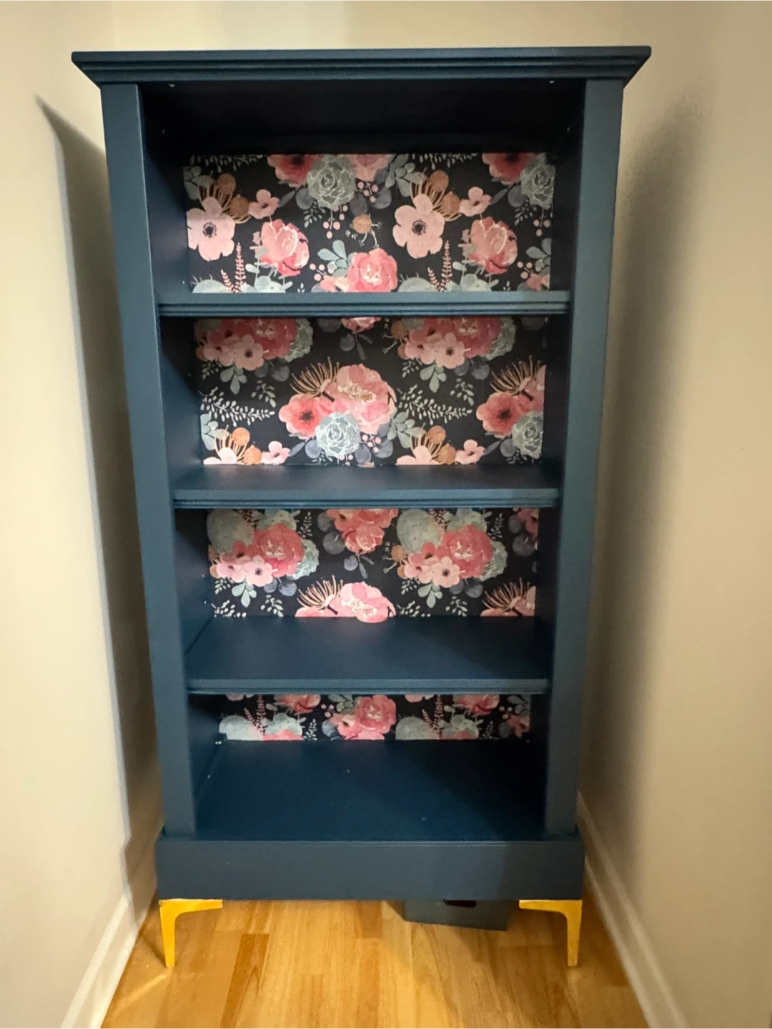 Here's a lovely blue bookshelf that would look great in any room! It features a pretty floral pattern on the back, adding a touch of charm and color. The gold-colored feet add a touch of elegance to the piece. It's in good condition and ready for a new home!