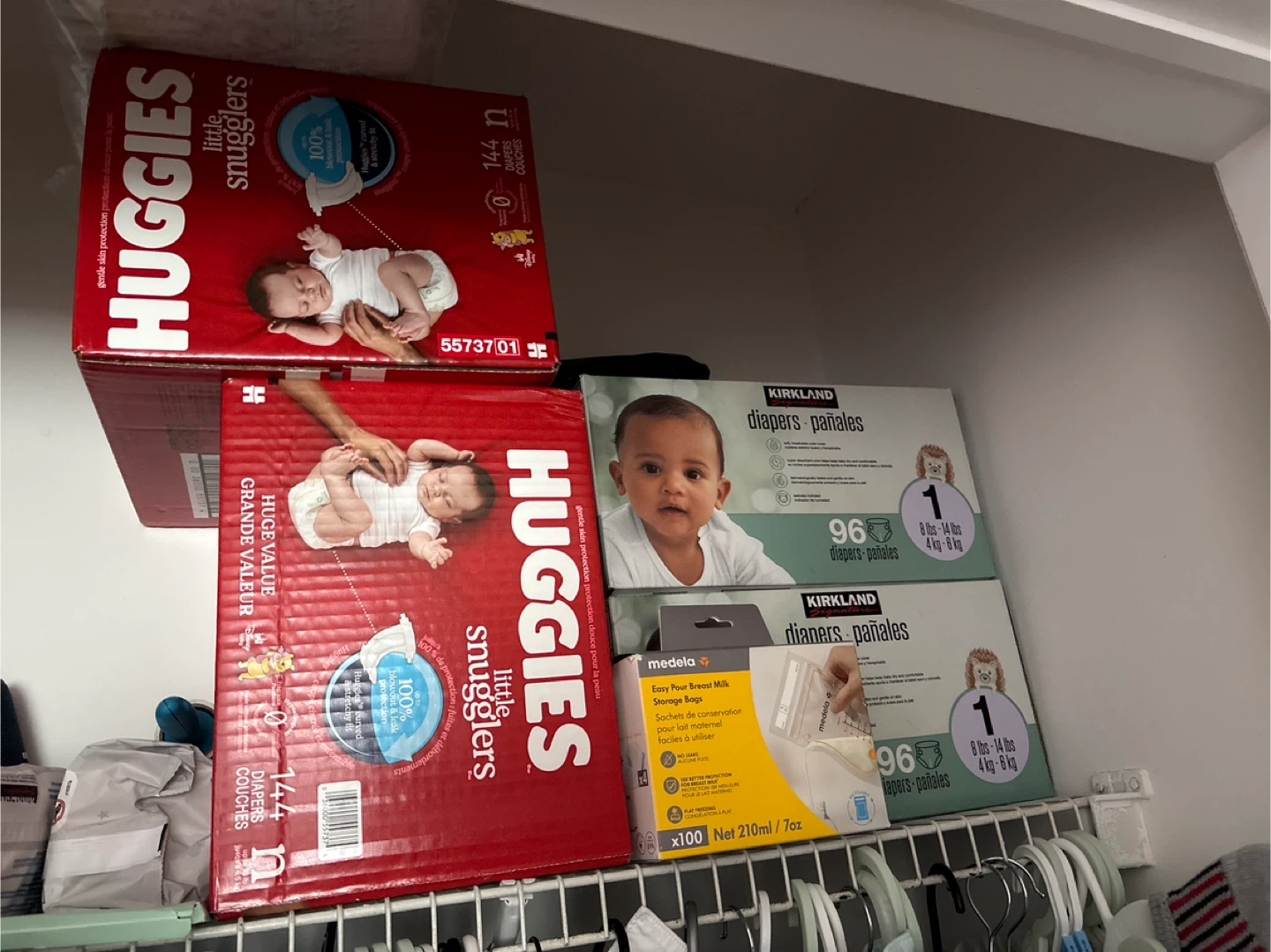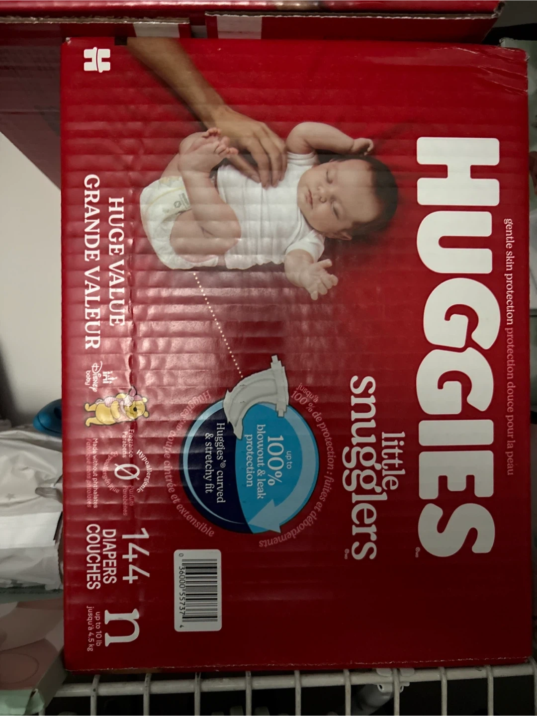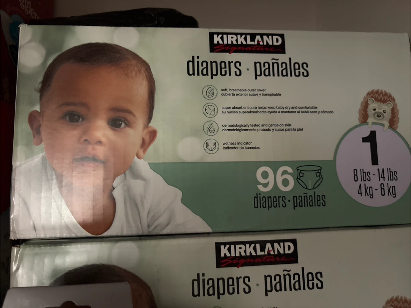 Selling 2 boxes of Kirkland Signature diapers, size 1. These are designed for babies weighing 8-14 lbs (4-6 kg). The box contains 96 diapers. They feature a soft, breathable outer cover and a super absorbent core to keep baby dry and comfortable and 2 boxes of hugggies Diapers for newborn 144 diapers each box