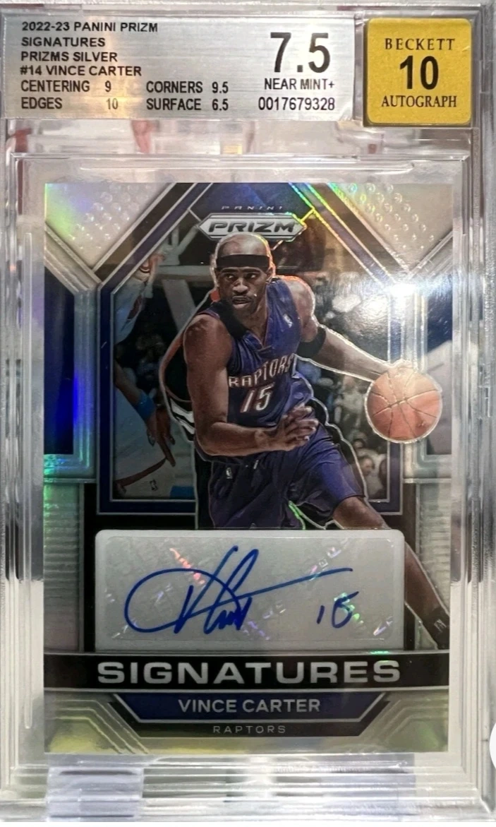Selling a Vince Carter 2022-23 Panini Prizm Signatures Silver card. It's graded by Beckett, with an autograph grade of 10. Corners are 9.5, centering is 9, edges are 10, and surface is 6.5. A great addition to any basketball card collection! Upon agreement, meet up will be at 11 Division 3030 Erin Mills pkwy, with a PAID Police officer to keep both parties safe