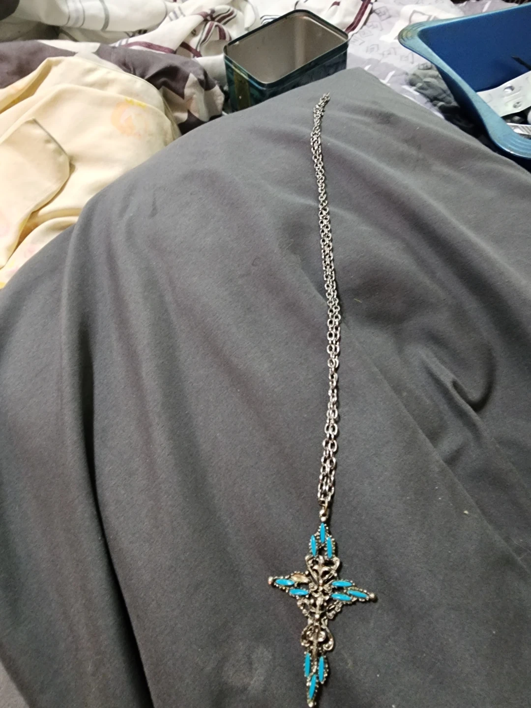 Selling a lovely cross pendant necklace! The chain is silver-toned, and the cross features turquoise-coloured accents. It's a unique piece to add to your collection!