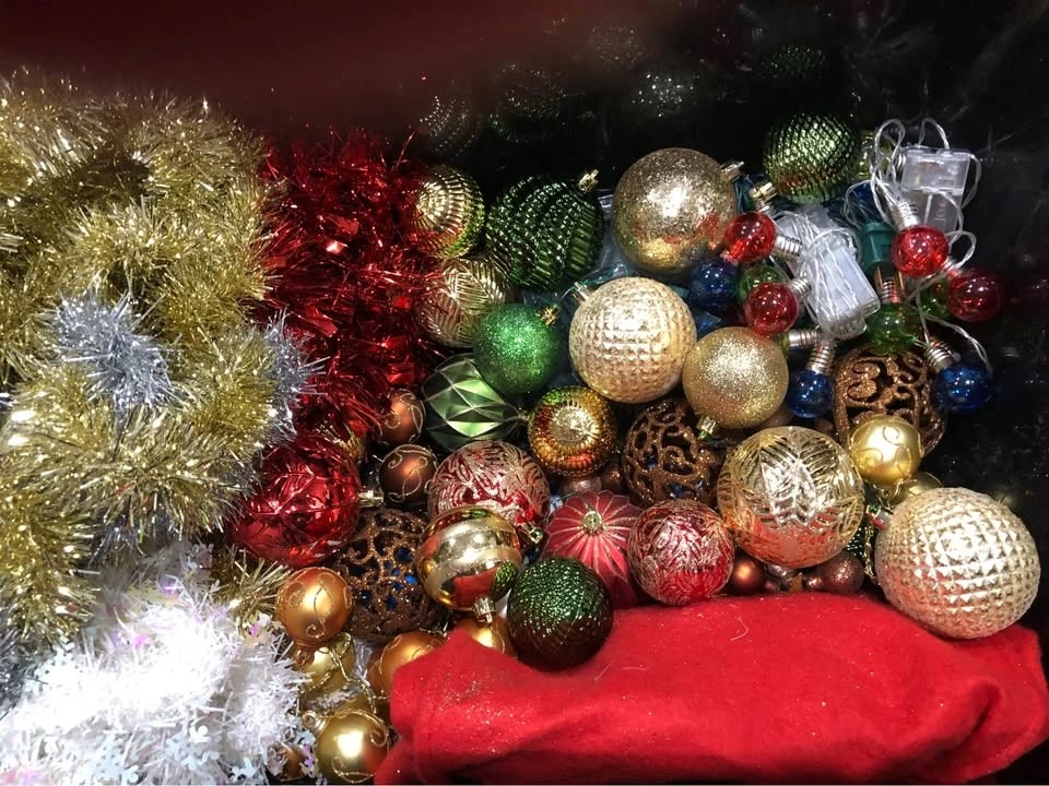 - ornaments of varying colours, textures, etc. Some are shiny, some have glitter. Some have different shapes.