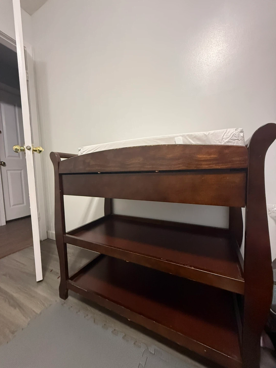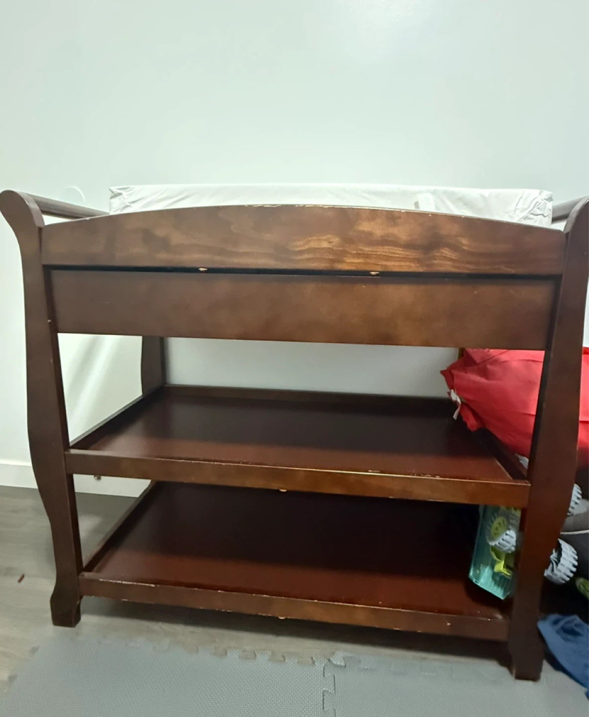 Selling a wooden baby changing table in good condition. It has three shelves for storage, perfect for keeping baby essentials organized and within reach. The changing surface is clean and ready for use. It's a sturdy and reliable piece of furniture for your little one's nursery
