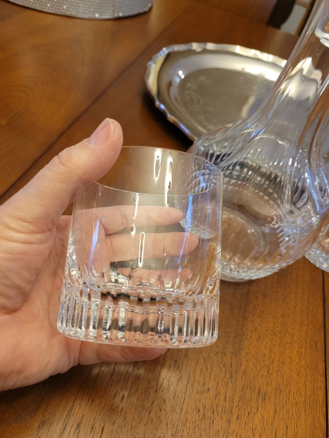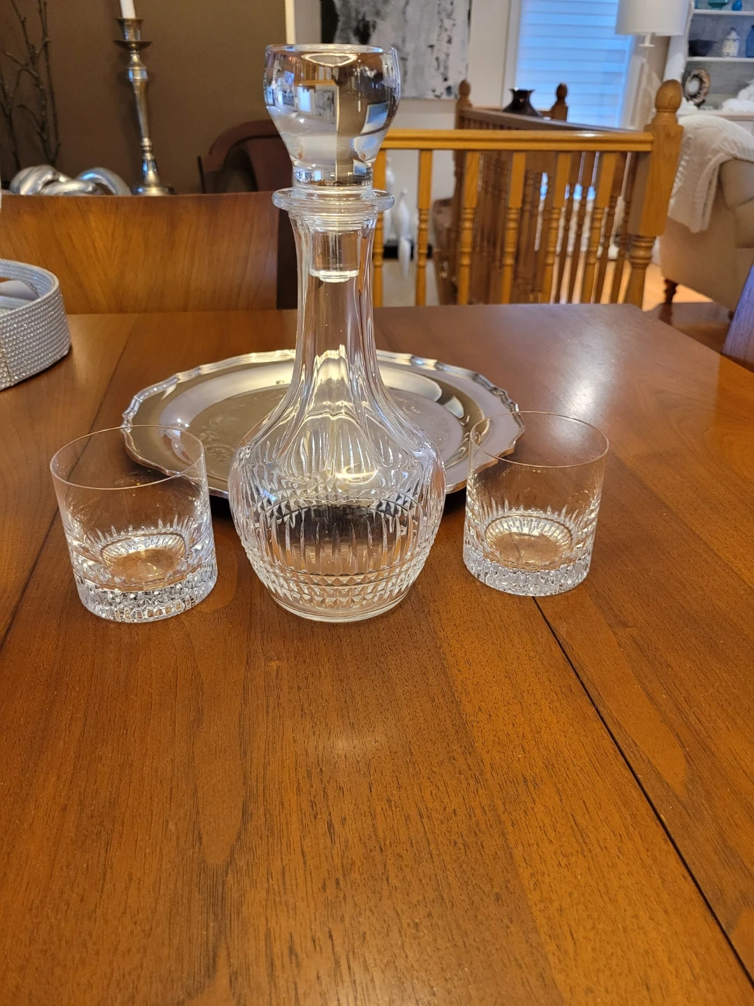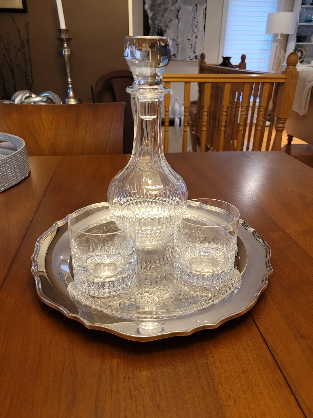 Here's a lovely crystal decanter set, perfect for your home bar or as a gift! It includes a decanter with a stopper, two matching glasses, and a decorative silver tray. The set is in great condition and ready to elevate your next gathering.
