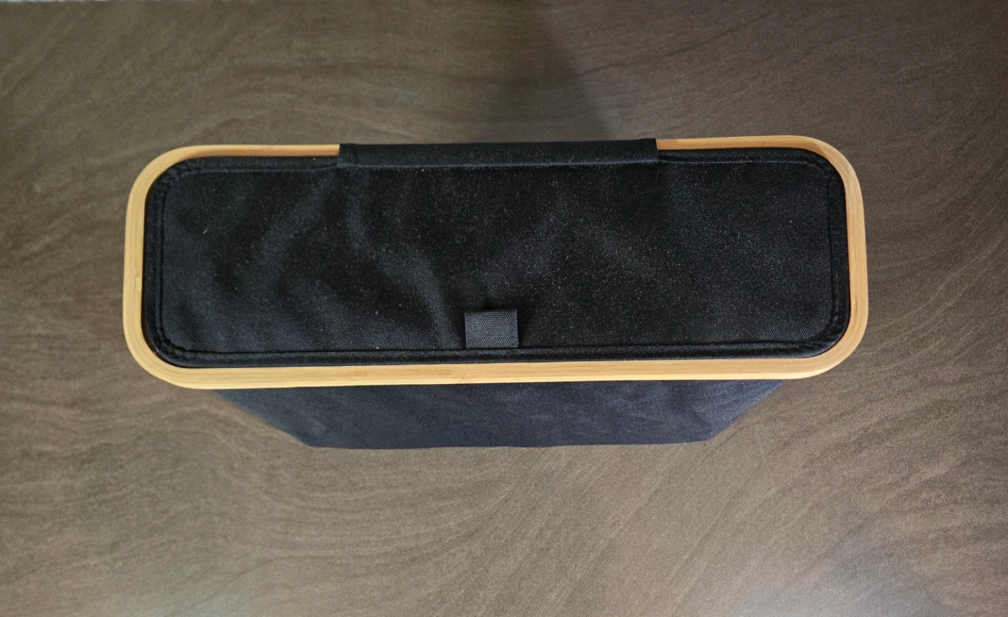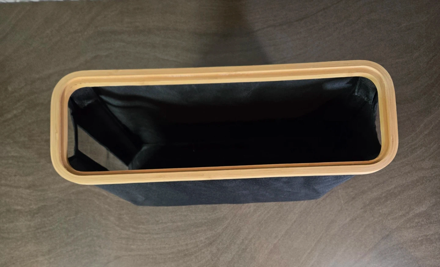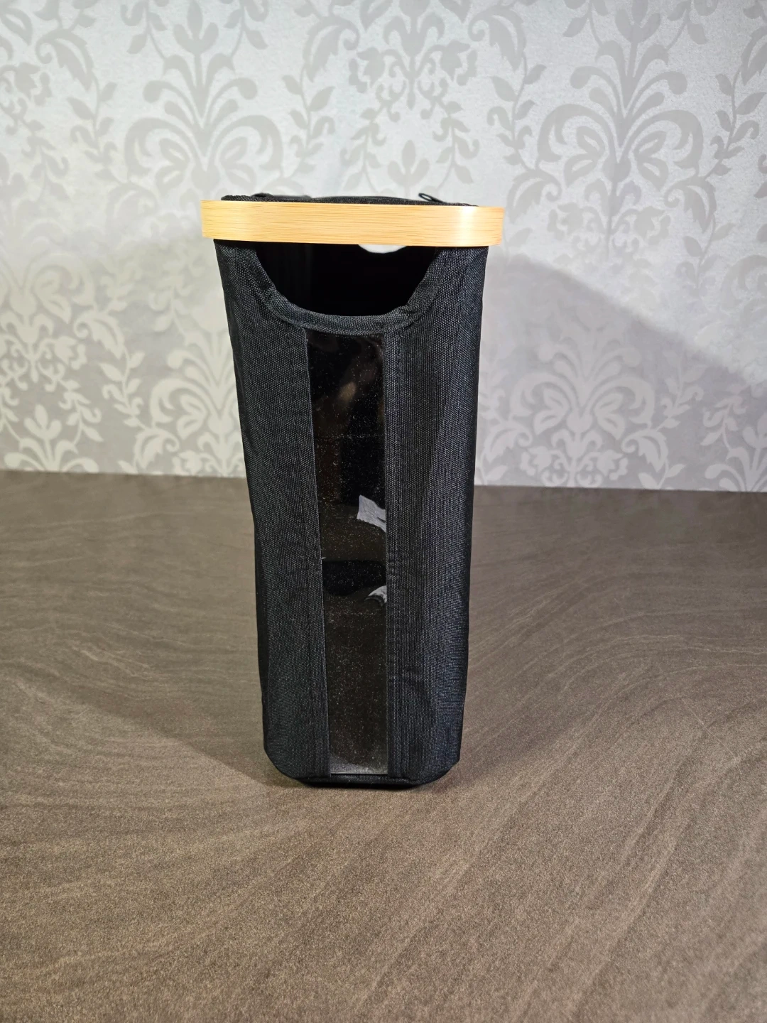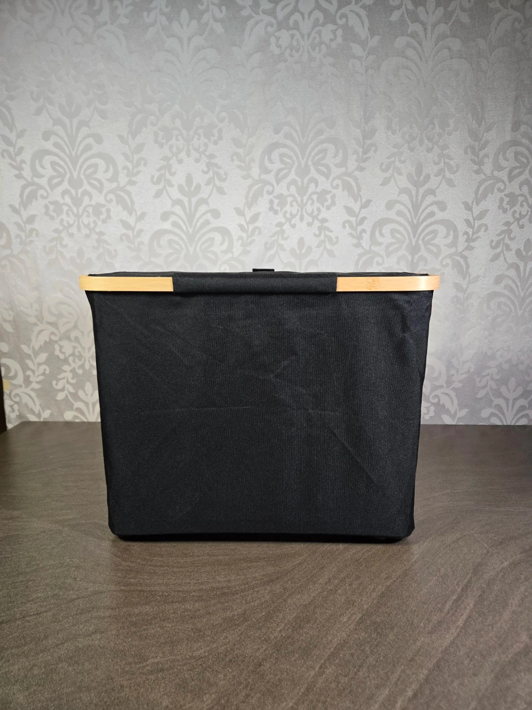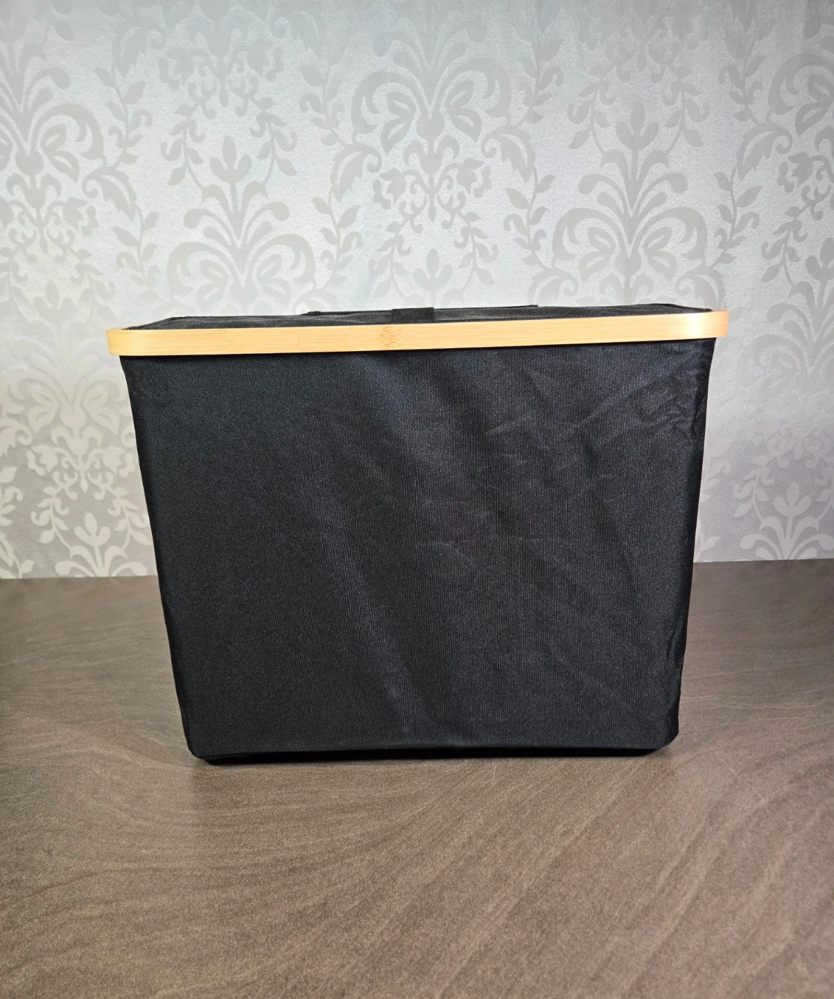 Great condition. 15" wide, 6" depth and 14" tall. Black fabric with a bamboo frame, perfect for organizing things around the house. Could be used in the bathroom, closet, or any room that needs a bit of tidying up. Convenient side window allows you to easily check the toilet paper inventory and refill it when needed. Bottom of the basket has an anti-slip floor bracket. Cross-posted.