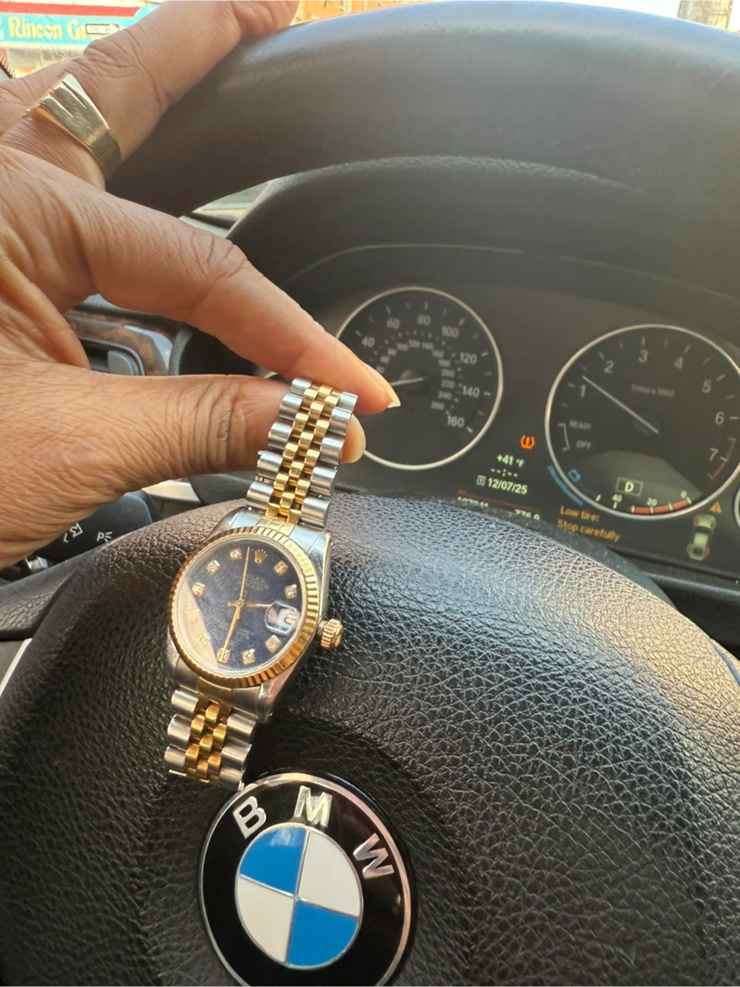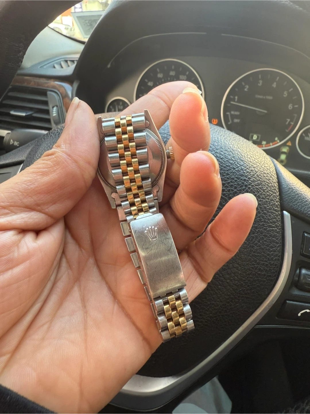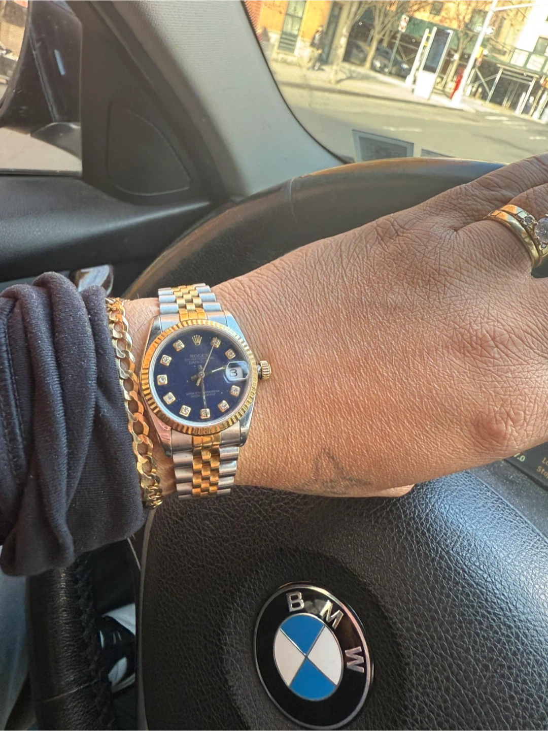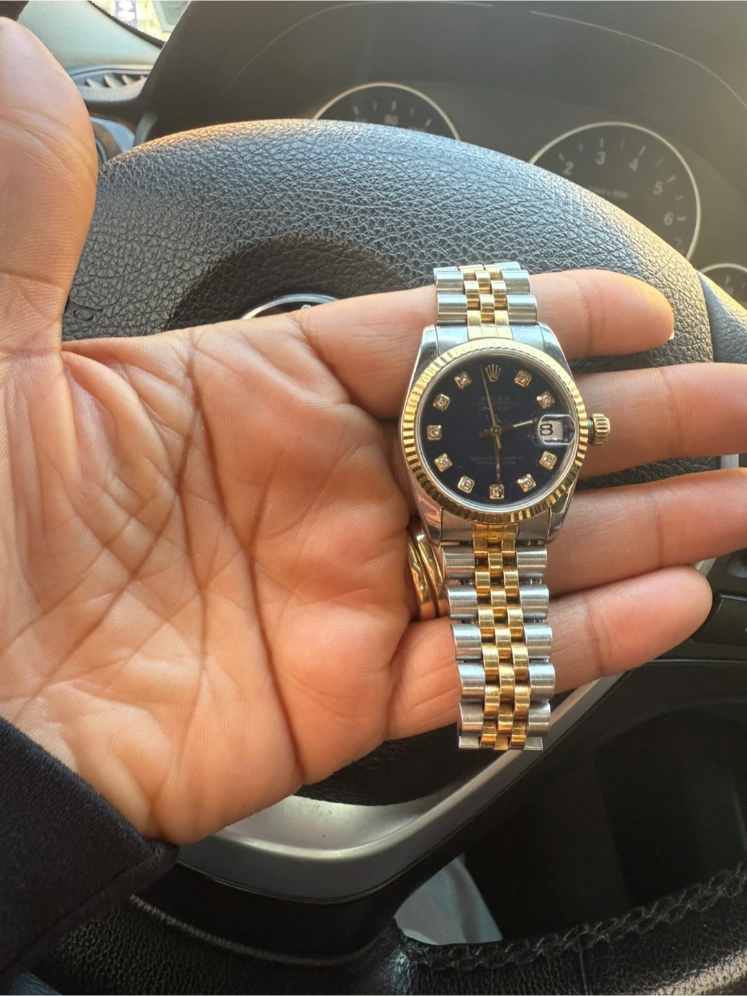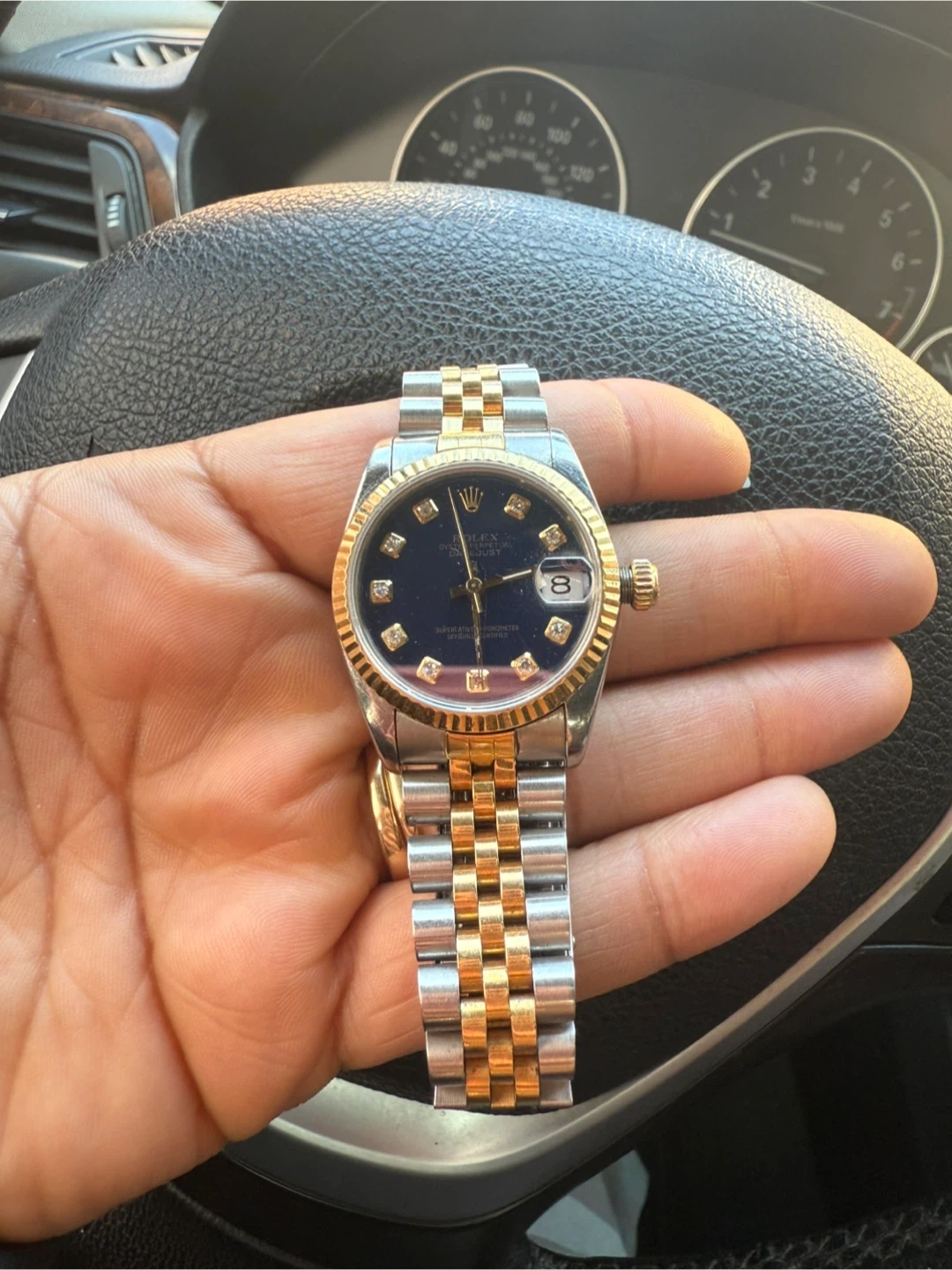 Selling a Rolex Datejust watch in a two-tone design. It features a silver and gold band and a dark blue face. It's a stylish timepiece! Just like new it’s worth 11,000 selling for 4000 do to an emergency.