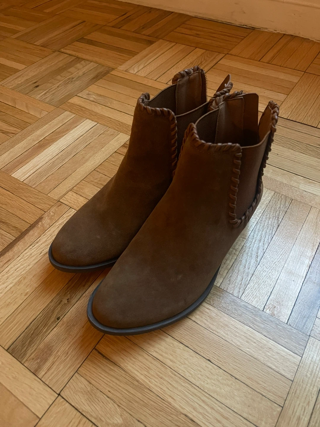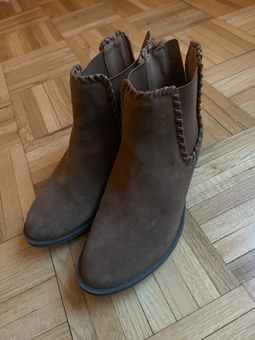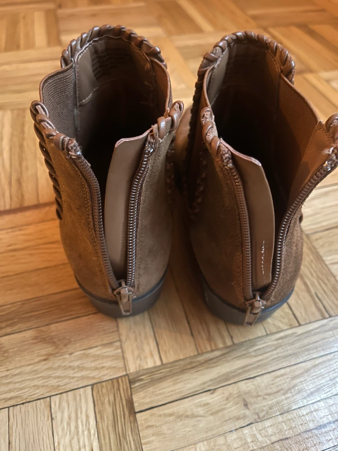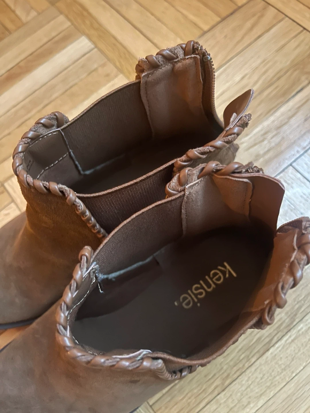 Selling a pair of Kensie ankle booties in a lovely brown suede. They are a women's size 6.5. These have a cute braided detail around the top. Perfect for fall!