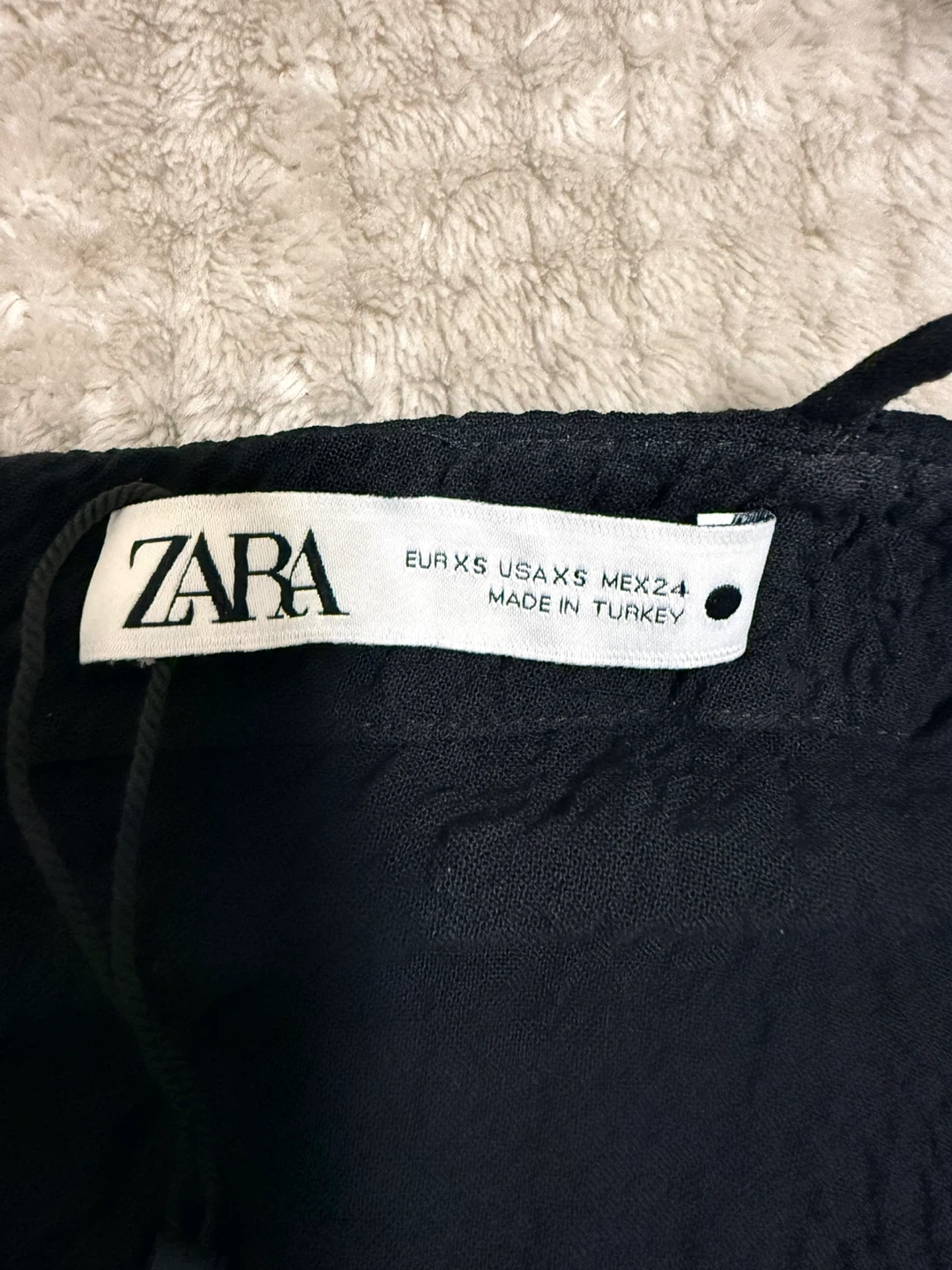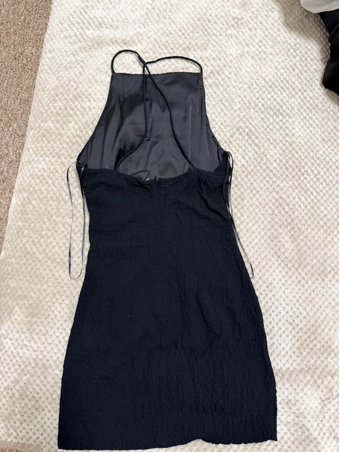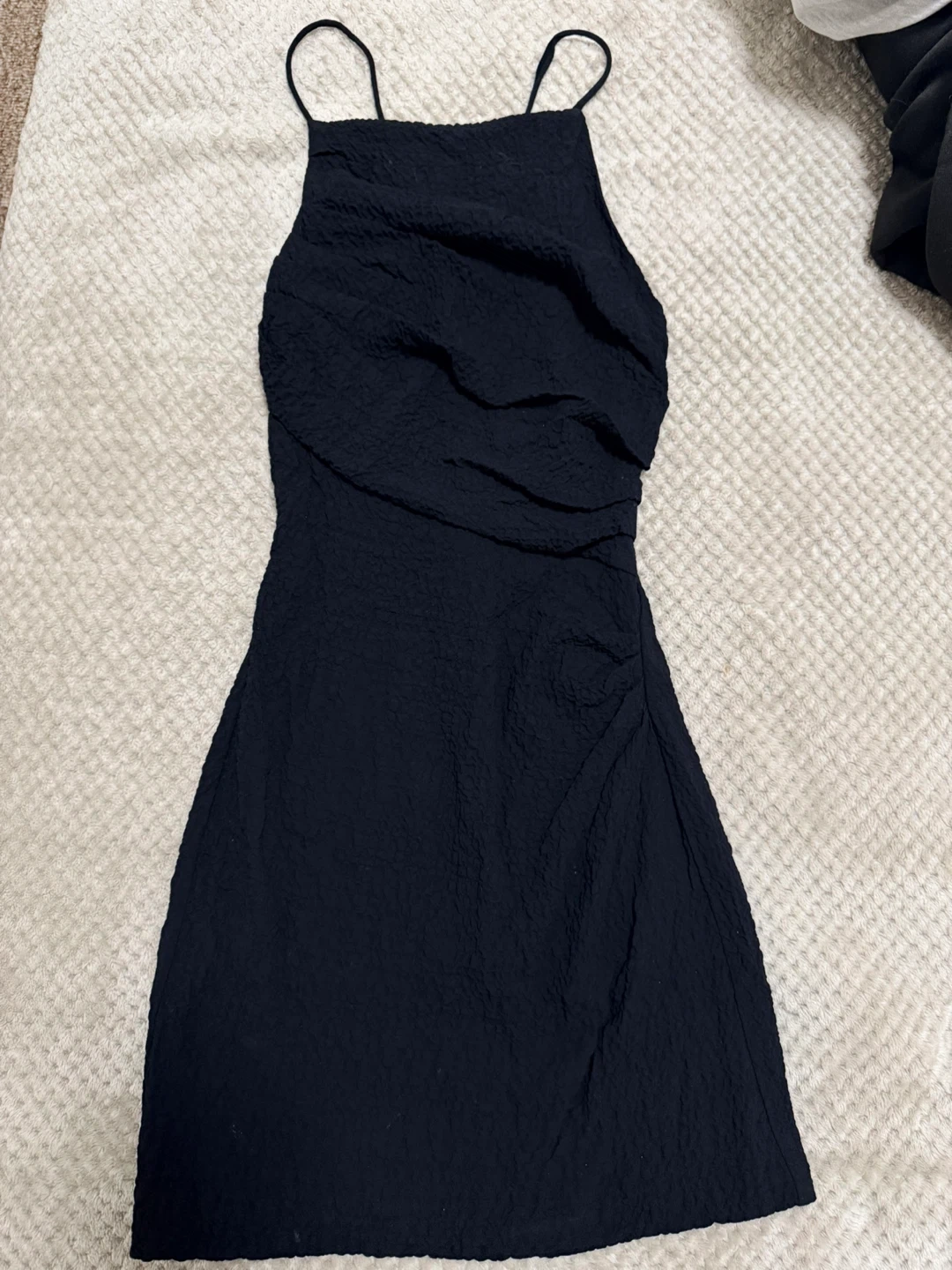 Selling a cute Zara black mini dress in size XS! It's in great condition and perfect for a night out or a casual day. The dress has a unique texture that adds a stylish touch