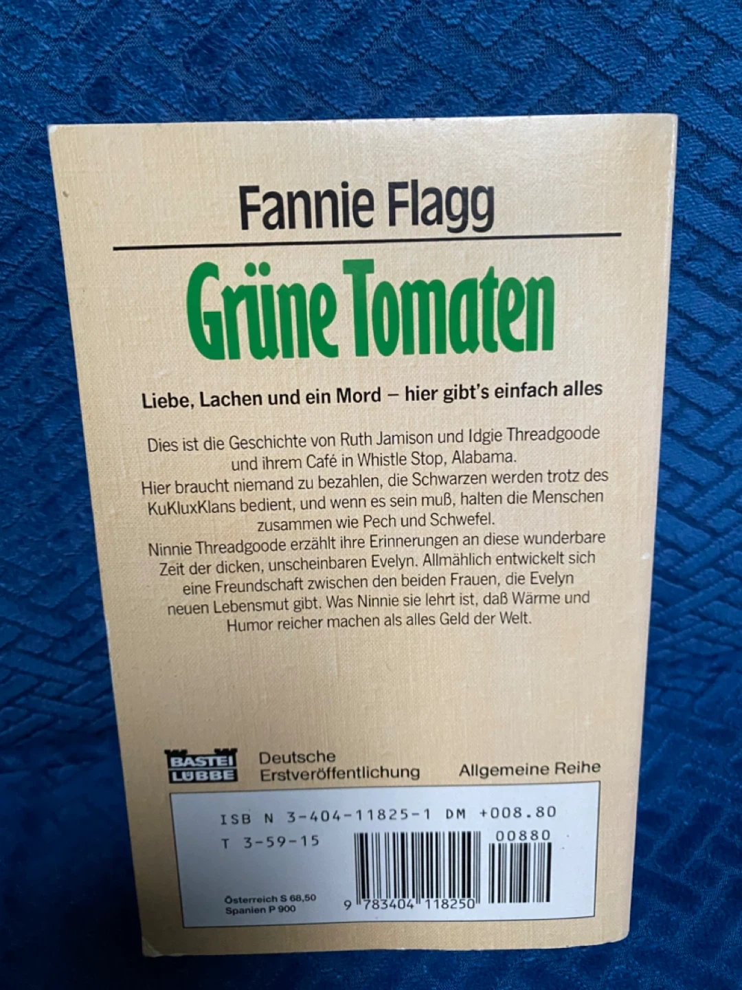 Selling a German version of Fannie Flagg's novel, "Grüne Tomaten" (Fried Green Tomatoes). It's a paperback edition by Bastei Lübbe. A heartwarming story about friendship and life in Whistle Stop, Alabama