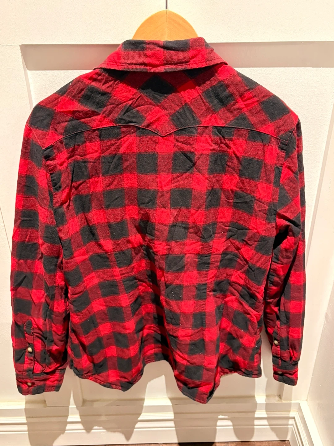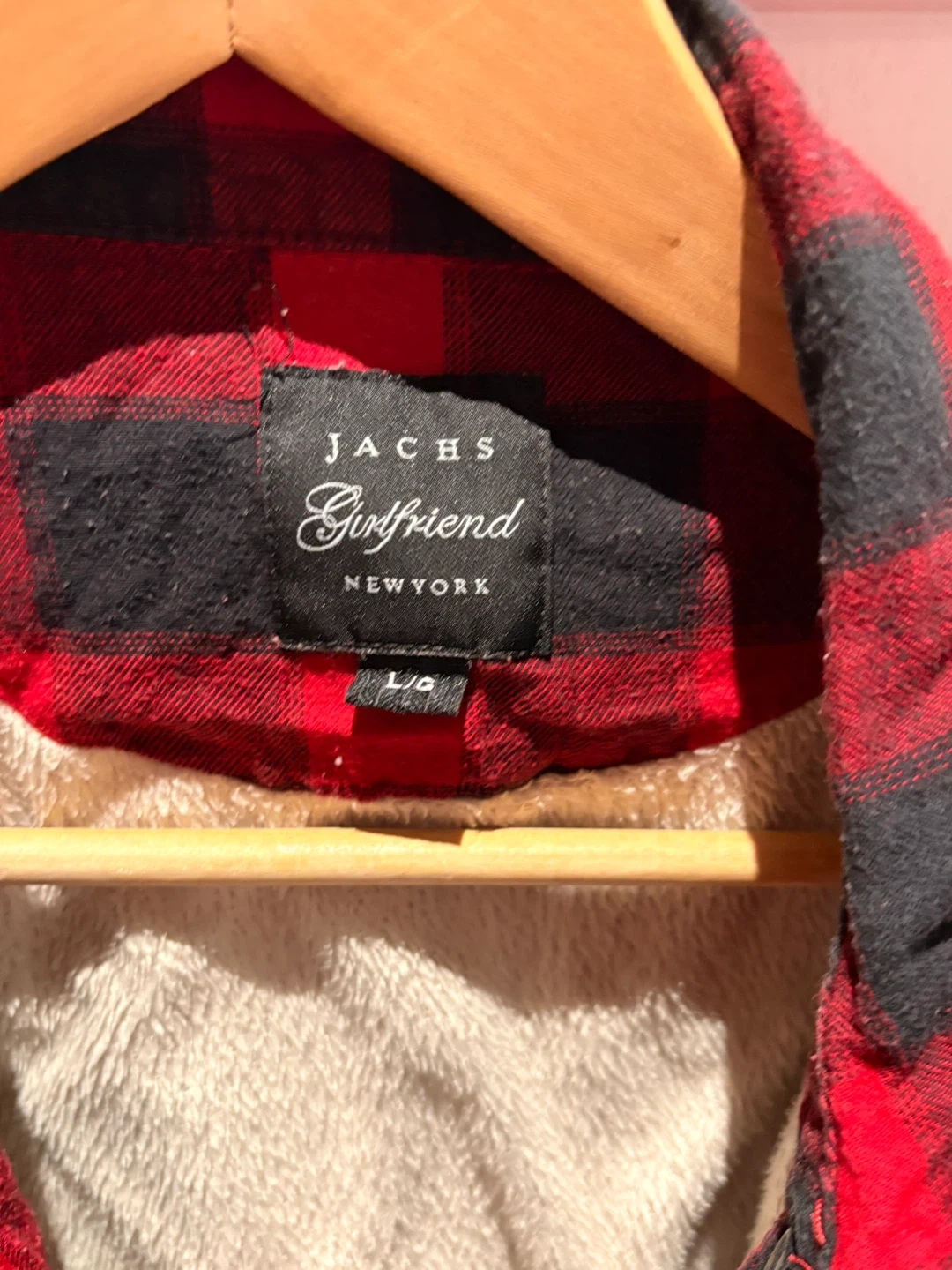 Cozy JACHS Girlfriend flannel shirt, perfect for layering! It's a size large and features a classic red and black plaid pattern. The inside is lined with a soft, plush material for extra warmth. Great for those chilly Canadian days!