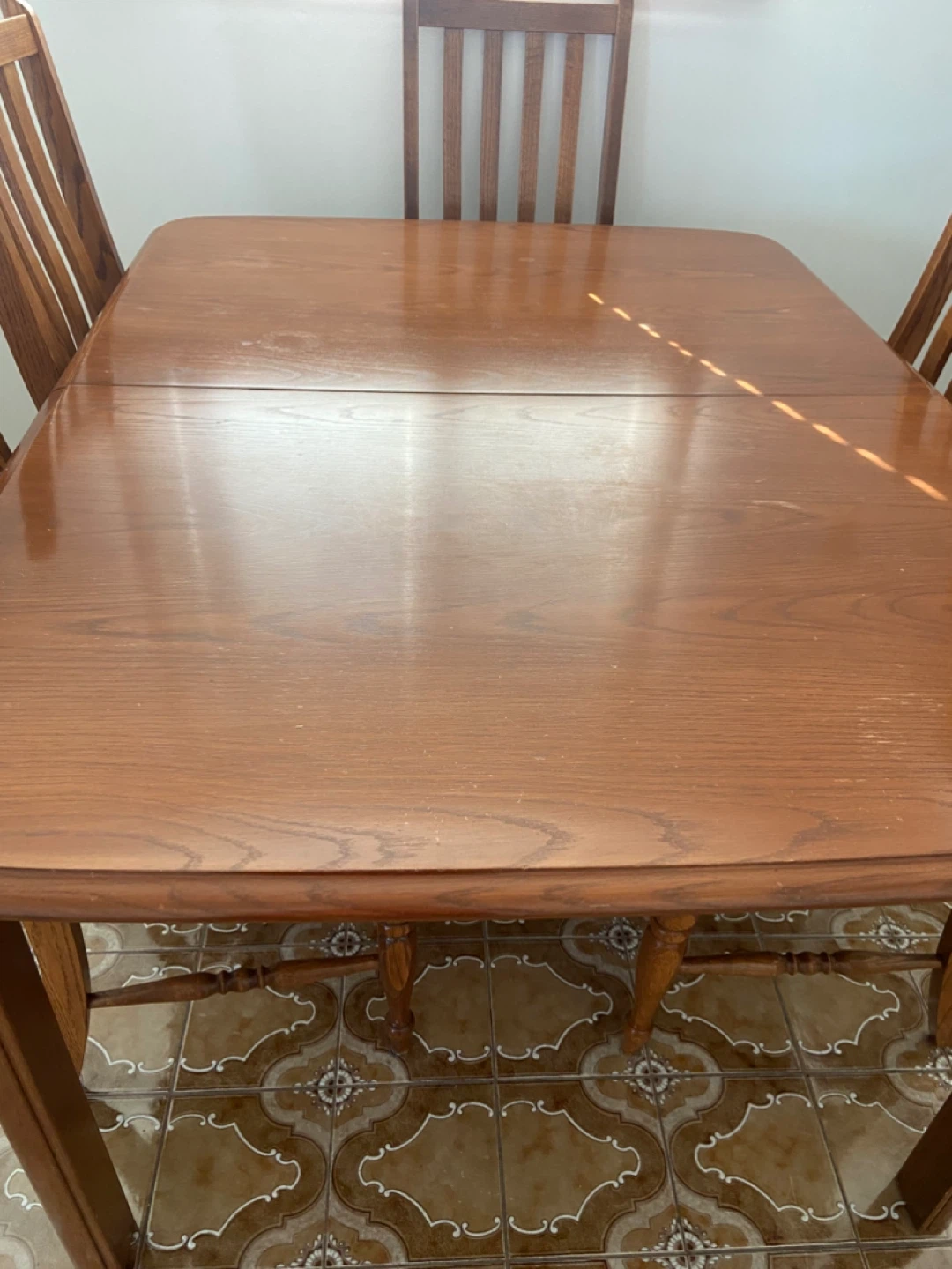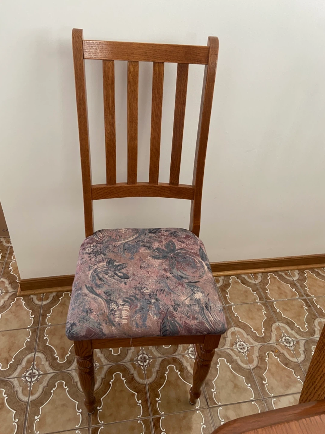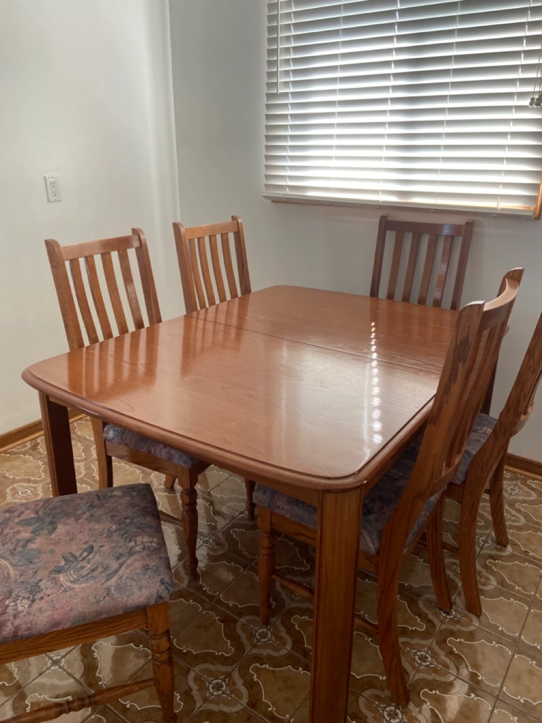 Selling a kitchen table set with six matching chairs. The table is a light brown wood, and the chairs have patterned fabric seats. It's a great set for a family or anyone who enjoys hosting dinners! Also comes with a leaf for extended space.