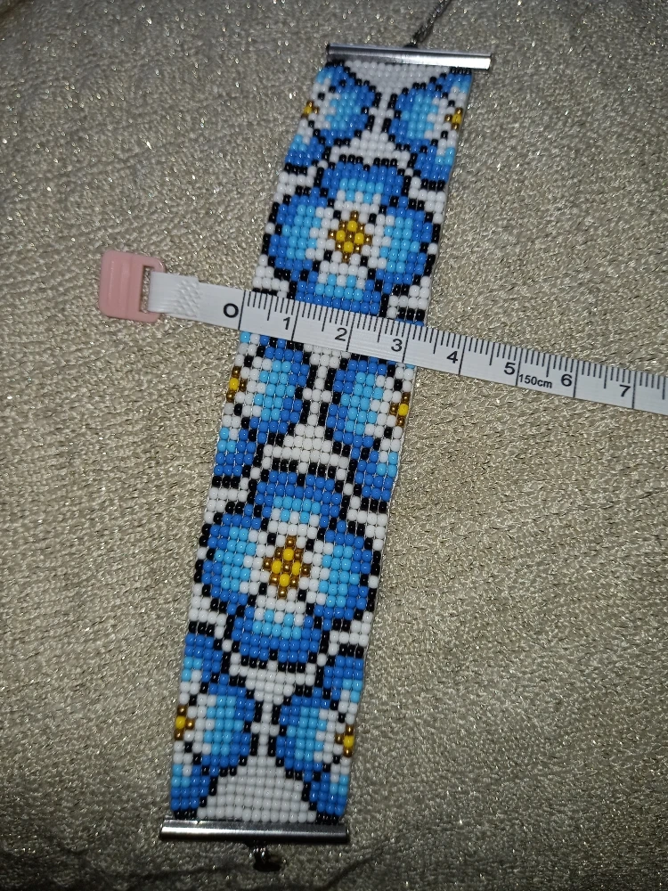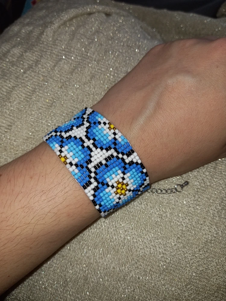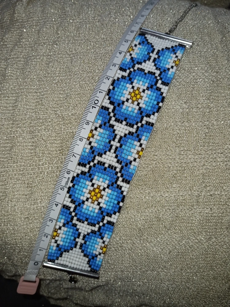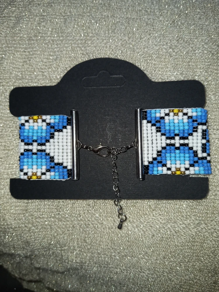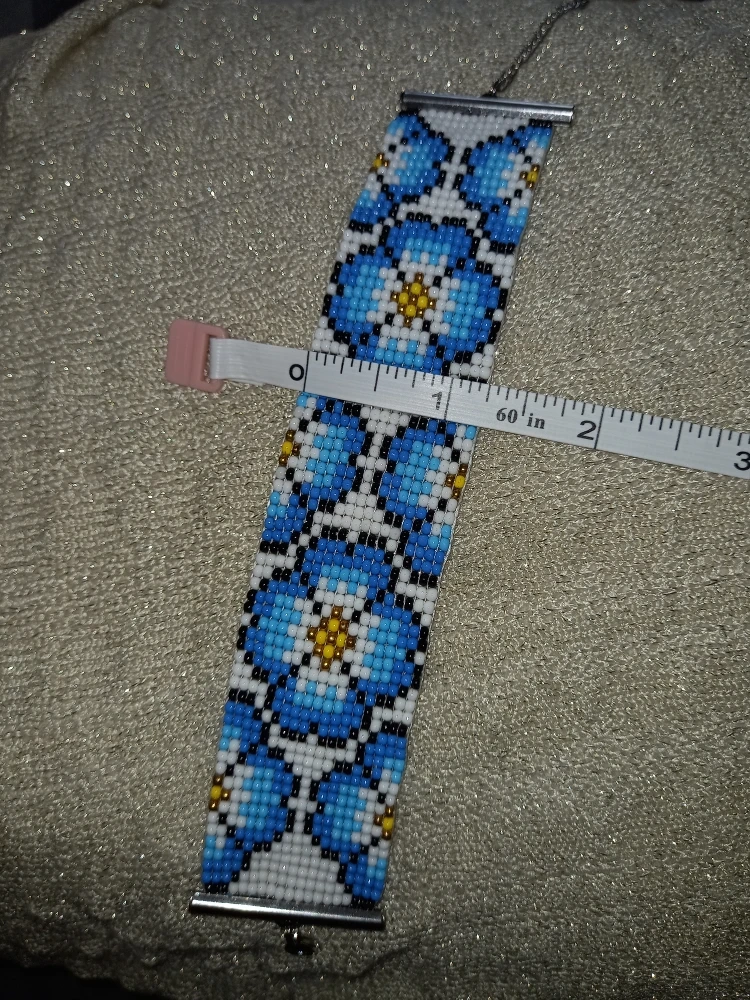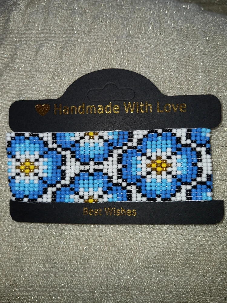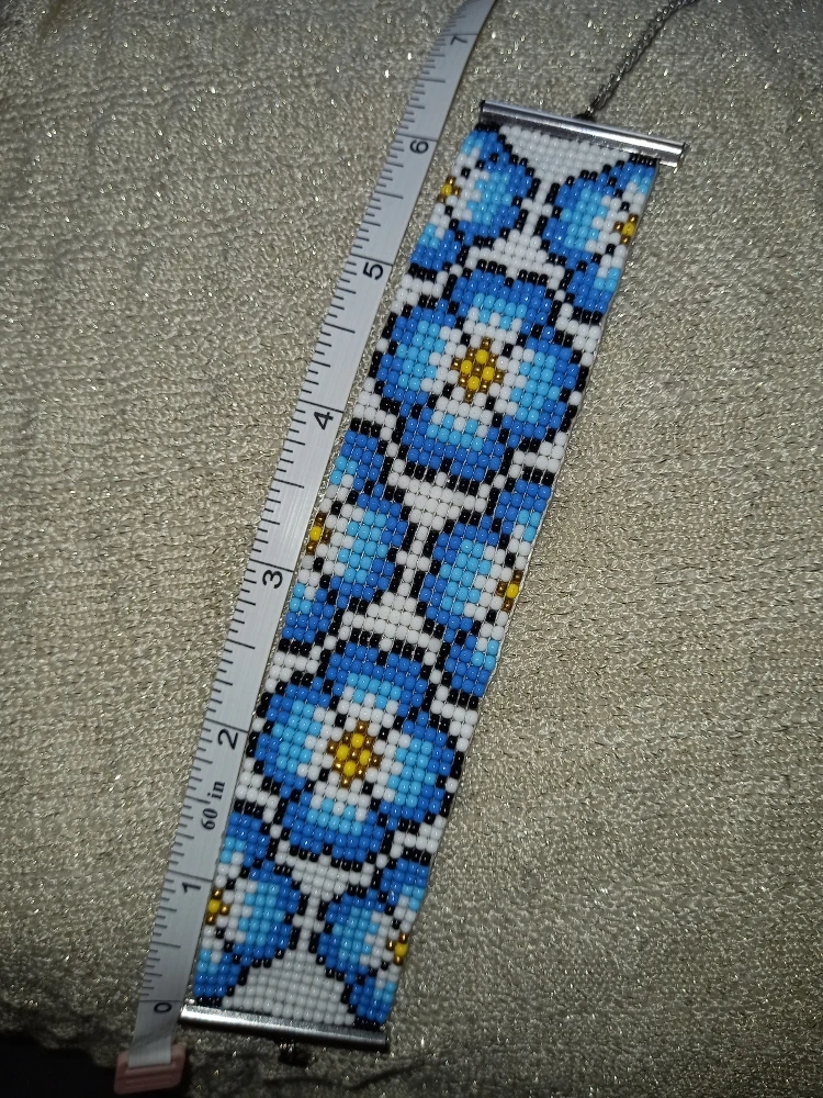 This is a beautiful handmade beaded bracelet with a lovely floral design in shades of blue, white, and yellow. It measures approximately 6 inches in length. Perfect for adding a touch of unique style to any outfit!