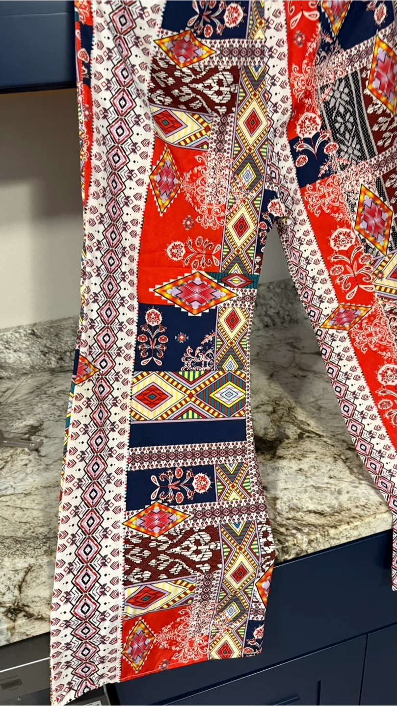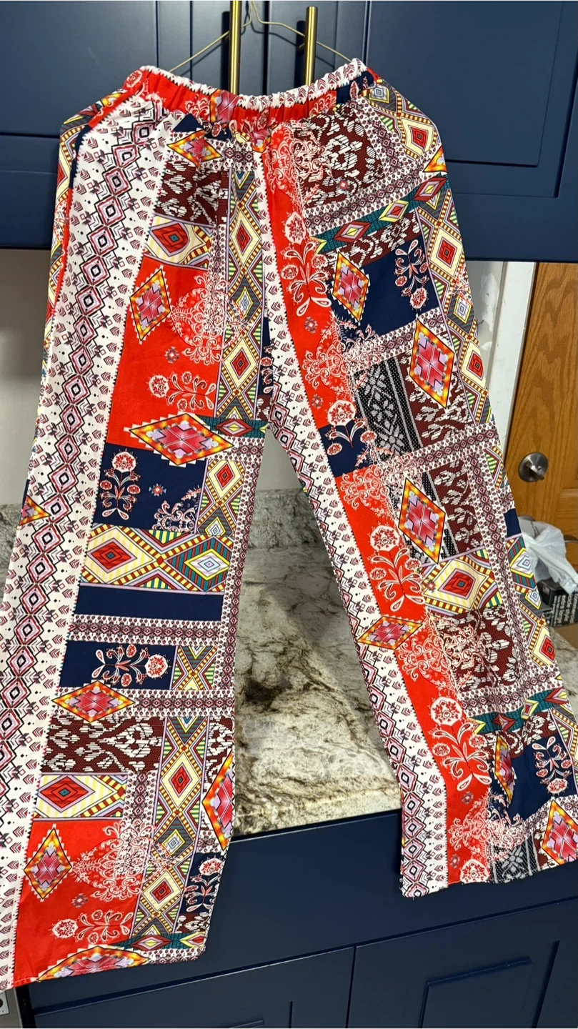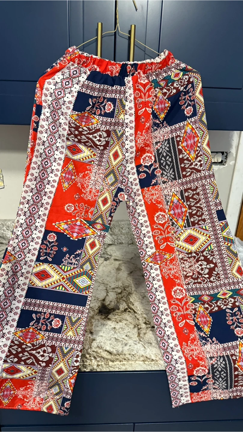 These patterned palazzo pants are super comfy and stylish! They feature a vibrant mix of red, white, and blue colors in a unique geometric and floral design. Perfect for adding a pop of color to your wardrobe!