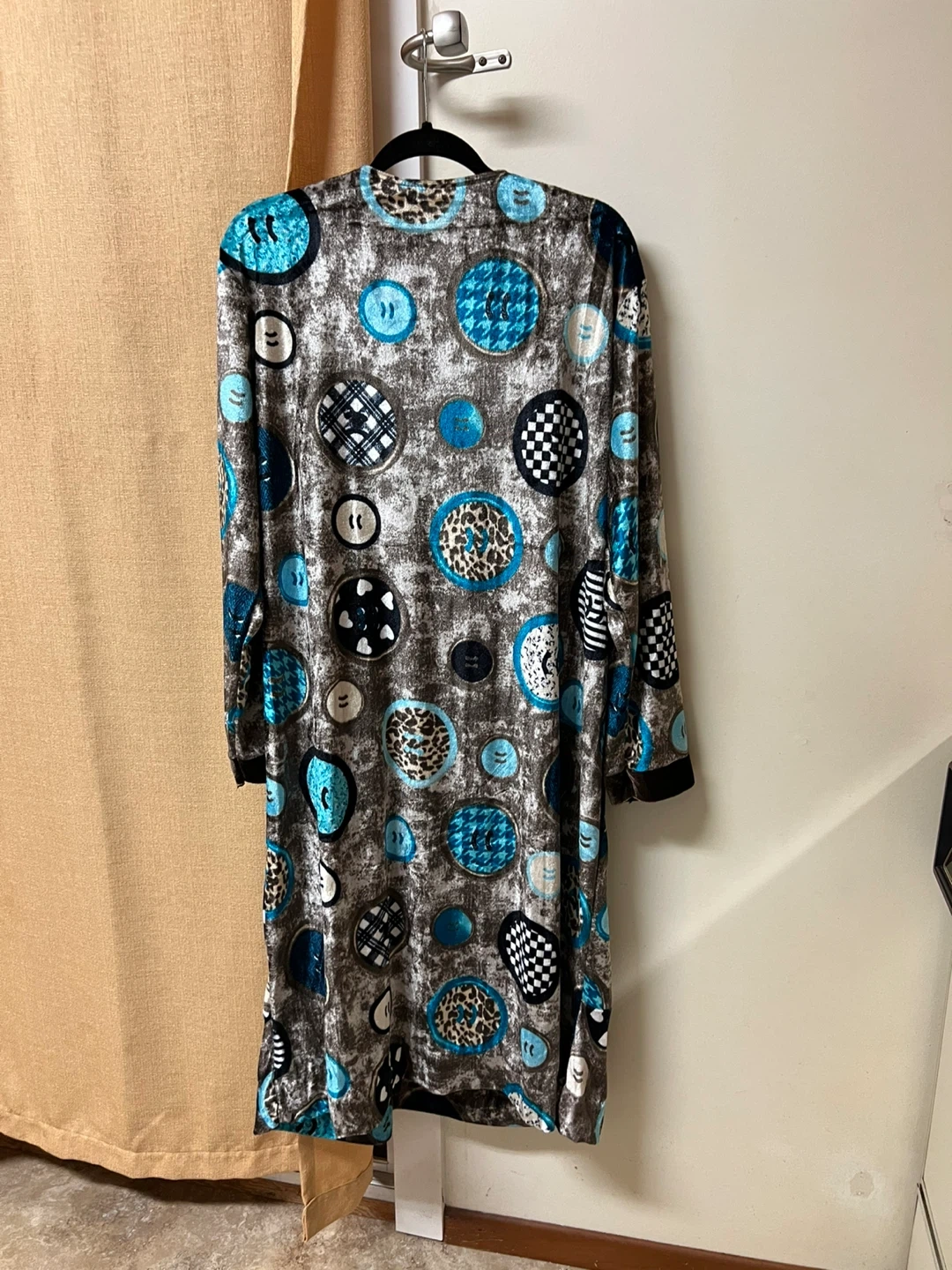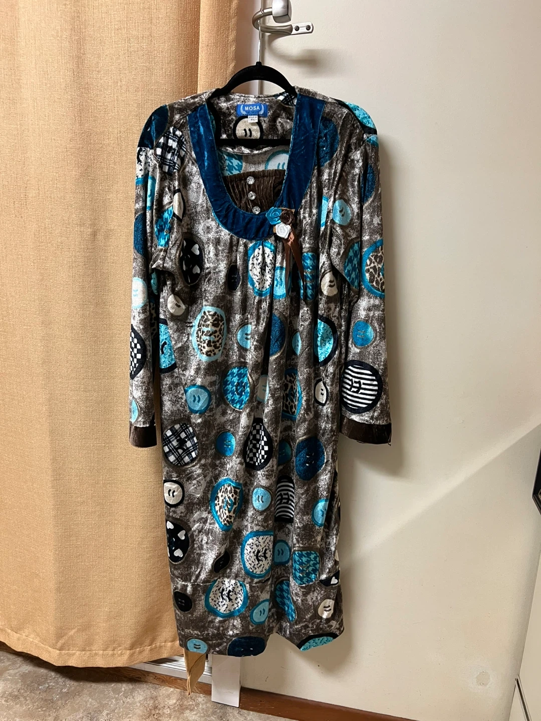 This is a cute Mosa dress with a fun button print! It features a mix of blue, brown, and black colours and has a unique design. Perfect for adding a pop of style to your wardrobe