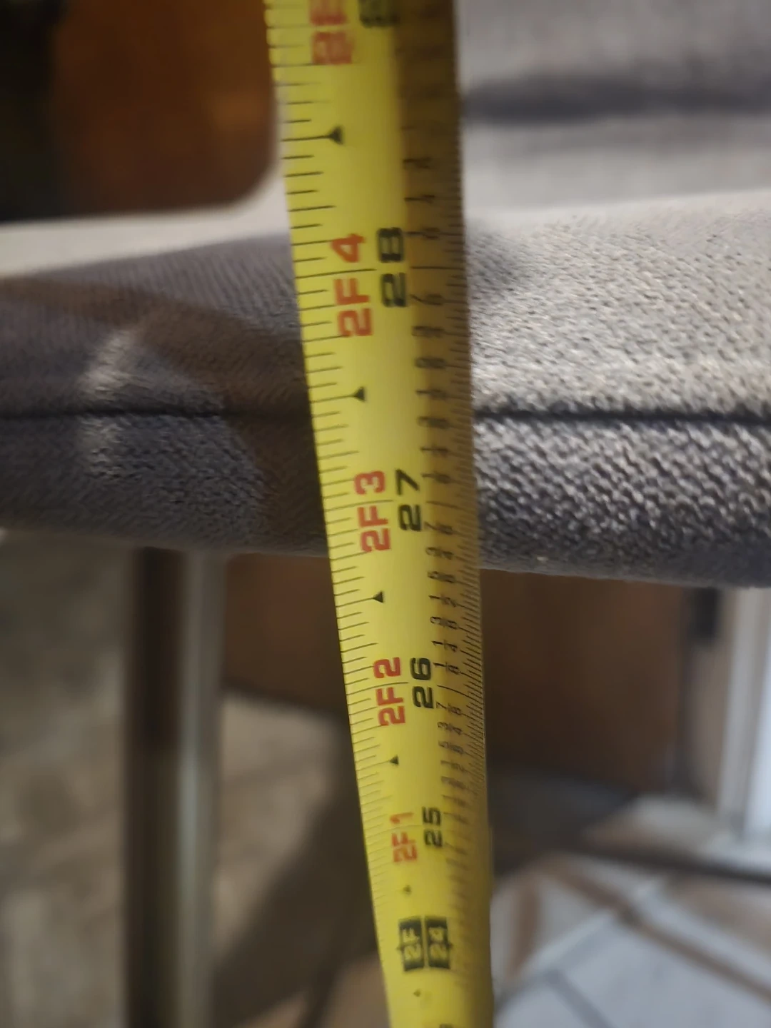 2 Selling a bar stool in gray. It measures between 26 and 28 inches in height. It's in great condition and would be a nice addition to your kitchen or bar area!
