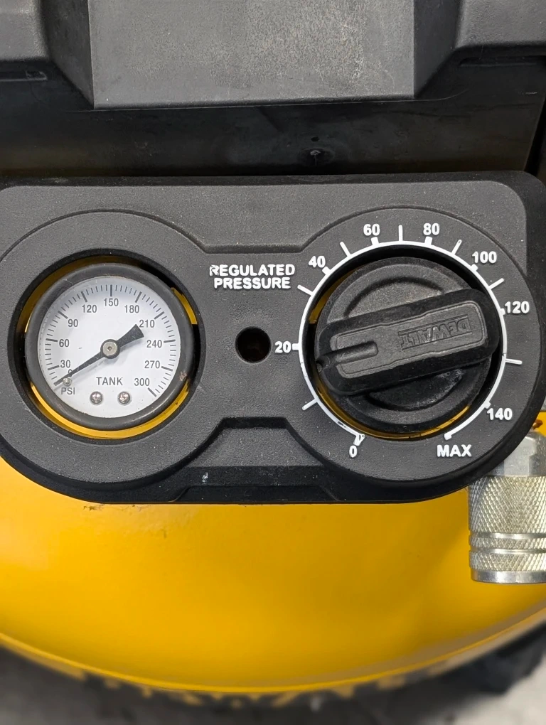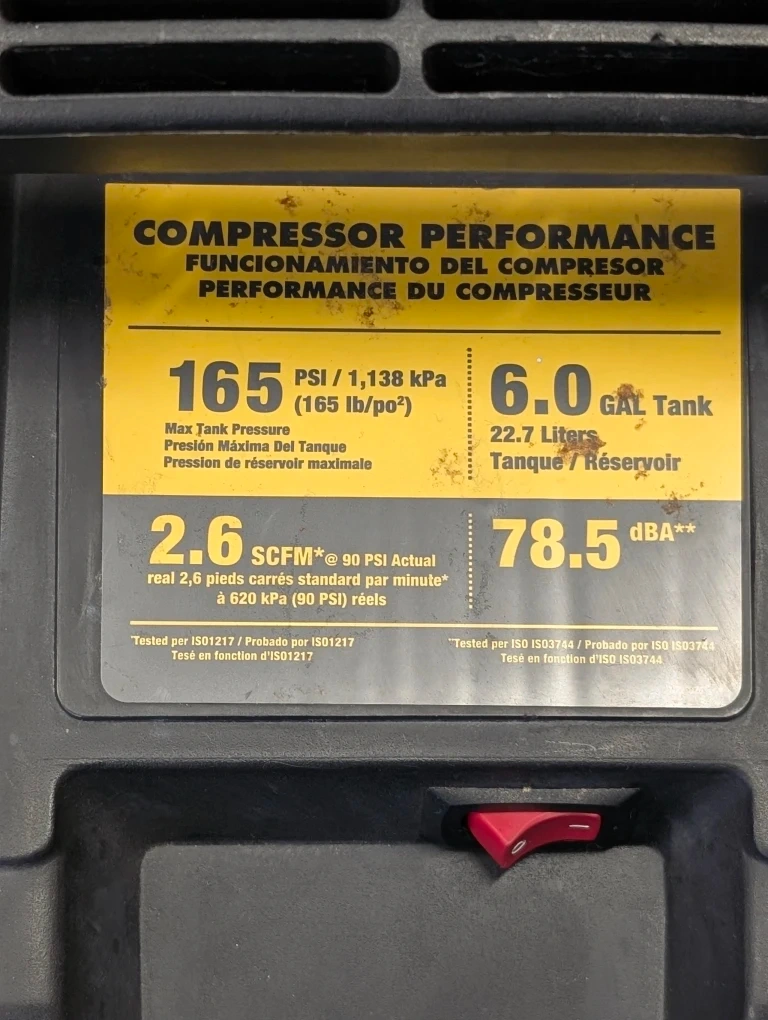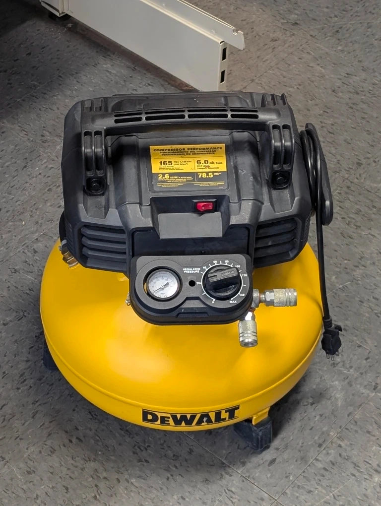 Selling a DeWalt 6.0 Gal tank air compressor. It features a compressor performance of 165 PSI / 1,138 kPa (165 lb/po²) and 2.6 SCFM*@ 90 PSI Actual. It also has a regulated pressure gauge and a max pressure setting.