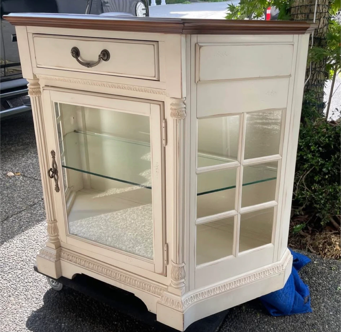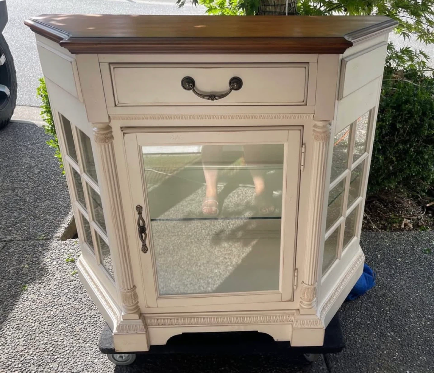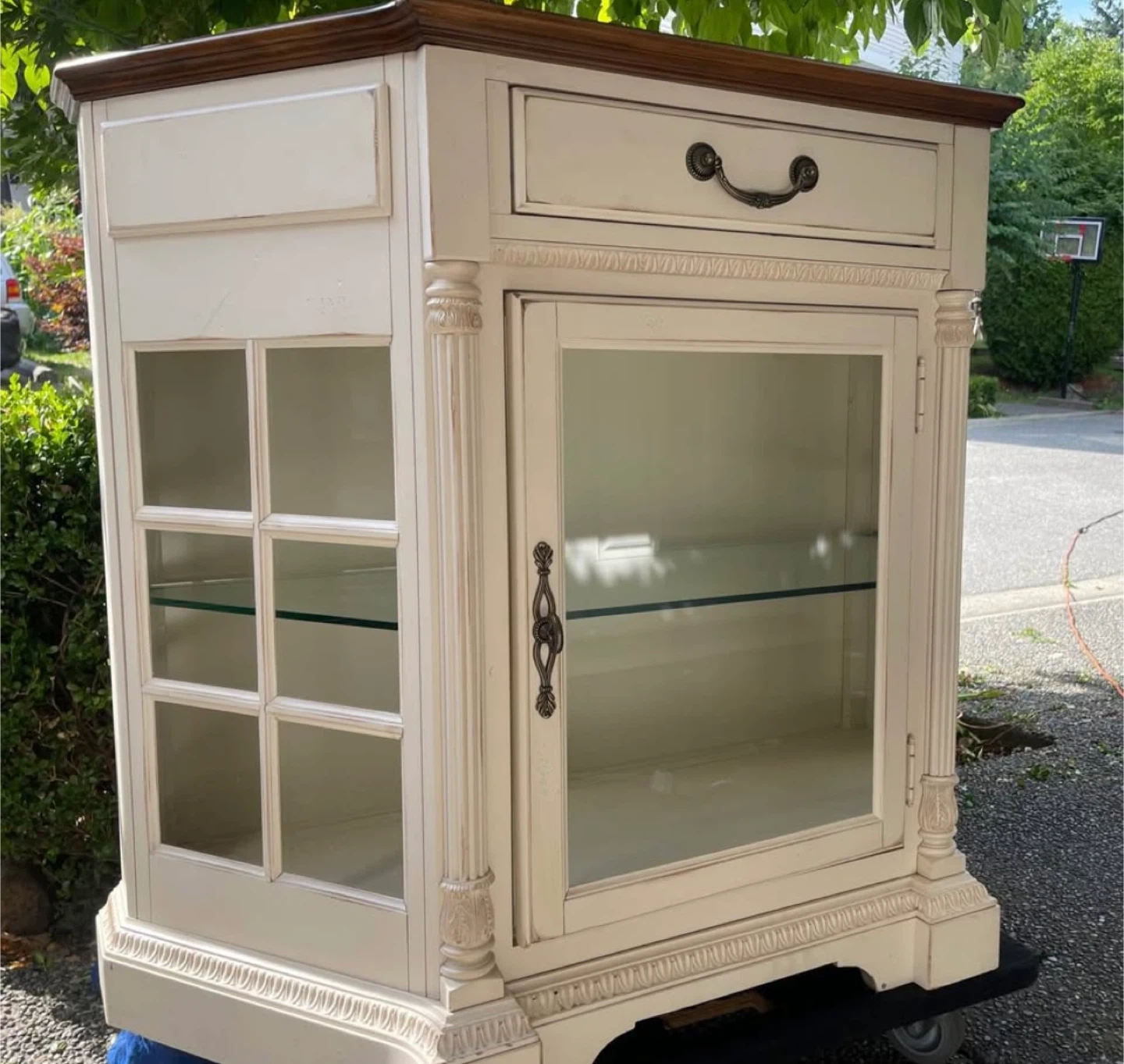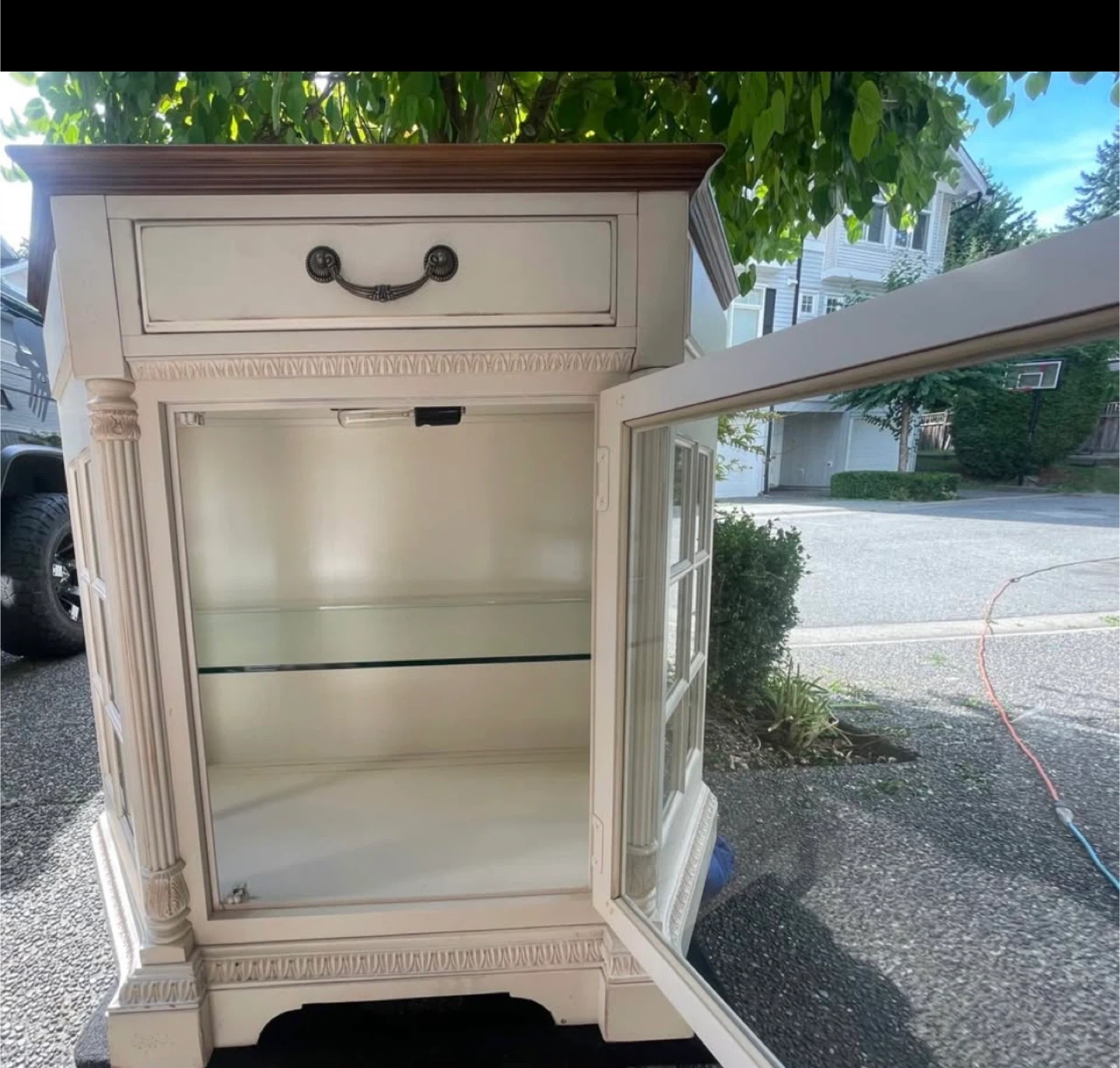 Selling a charming display cabinet! It features a glass door and a drawer, perfect for showcasing your favourite items or storing essentials. The cabinet has a cream colour with a brown top. It's in good condition and ready to add a touch of elegance to your home