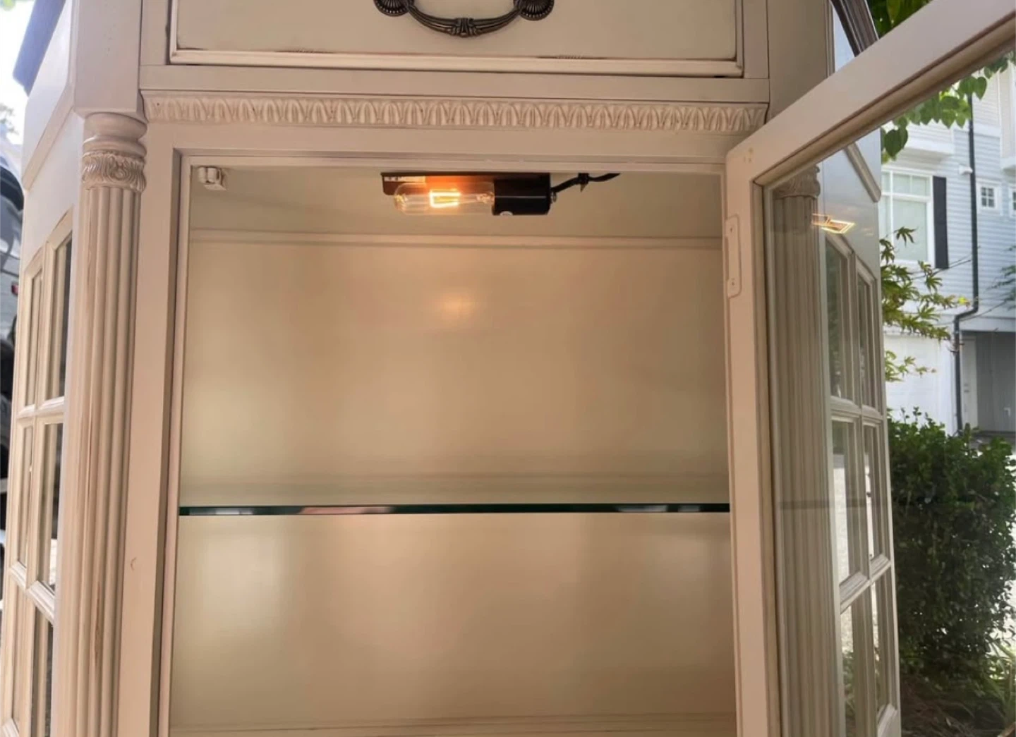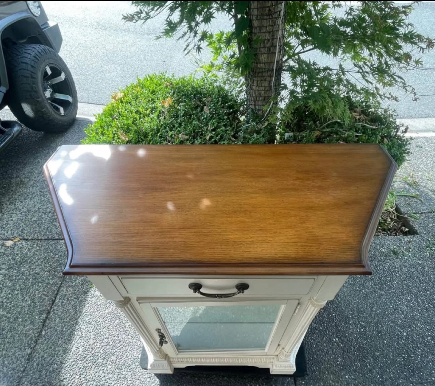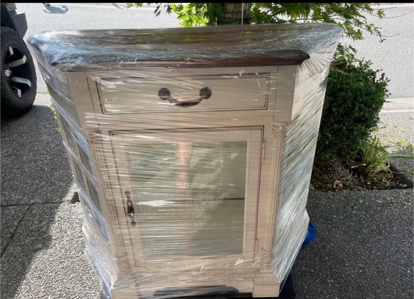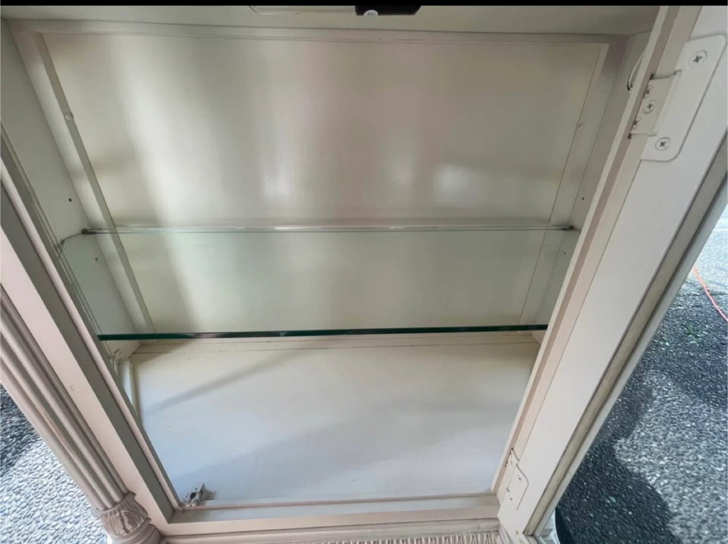 Selling a charming display cabinet! It features a glass door and a drawer, perfect for showcasing your favourite items or storing essentials. The cabinet has a cream colour with a brown top. It's in good condition and ready to add a touch of elegance to your home