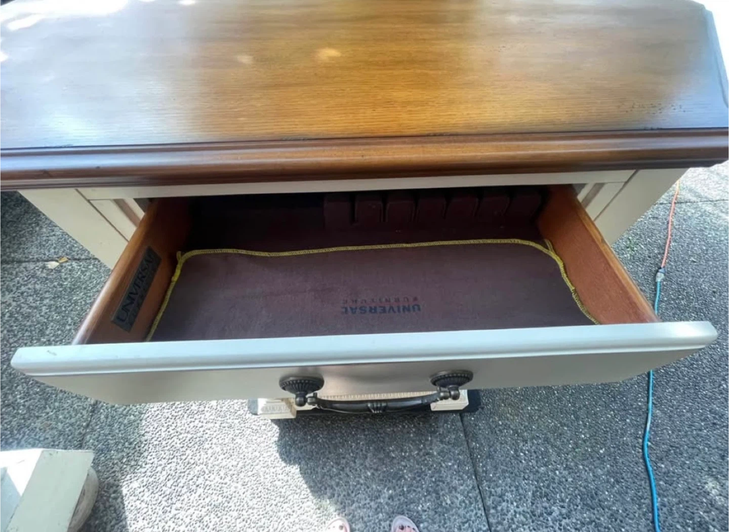 This display, China cabinet is like new with like a 2 tone provincial rustic/distress finish on the wood . No marks on the wood or glass. It has a three touch tone light system ( wall plug in ). It is made by universal furniture , it comes with the original soft cloth, in the drawer for your silverware with the velvet dividers underneath . it is very beautifully made in immaculate condition , great for your dining room display or even front door entry display . It has been shrink wrapped for protection. The measurements are …