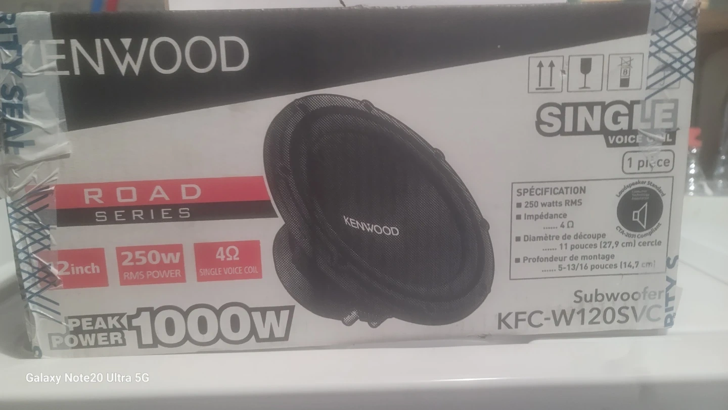 Selling a Kenwood 12-inch subwoofer, model KFC-W120SVC. It's from the Road Series and handles 250W RMS power with a 4Ω single voice coil. The peak power is 1000W. It has a mounting depth of 5-13/16 inches (14.7 cm).