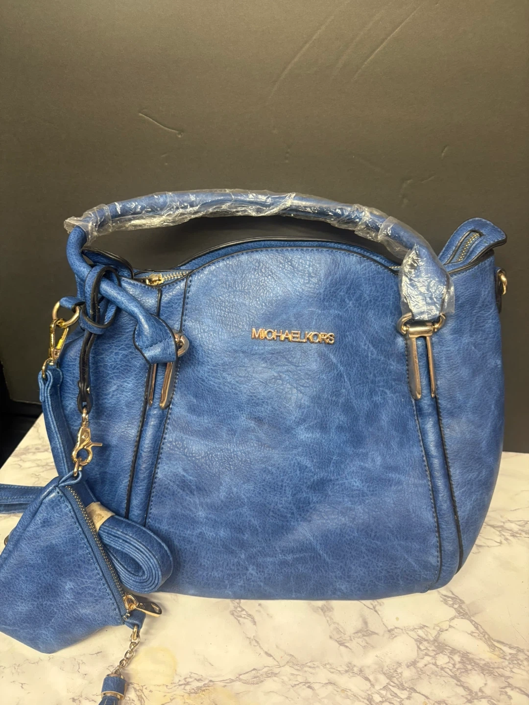 Selling a beautiful blue satchel bag from Michael Kors! It's in great condition and comes with a cute matching coin purse. Perfect for everyday use or a night out