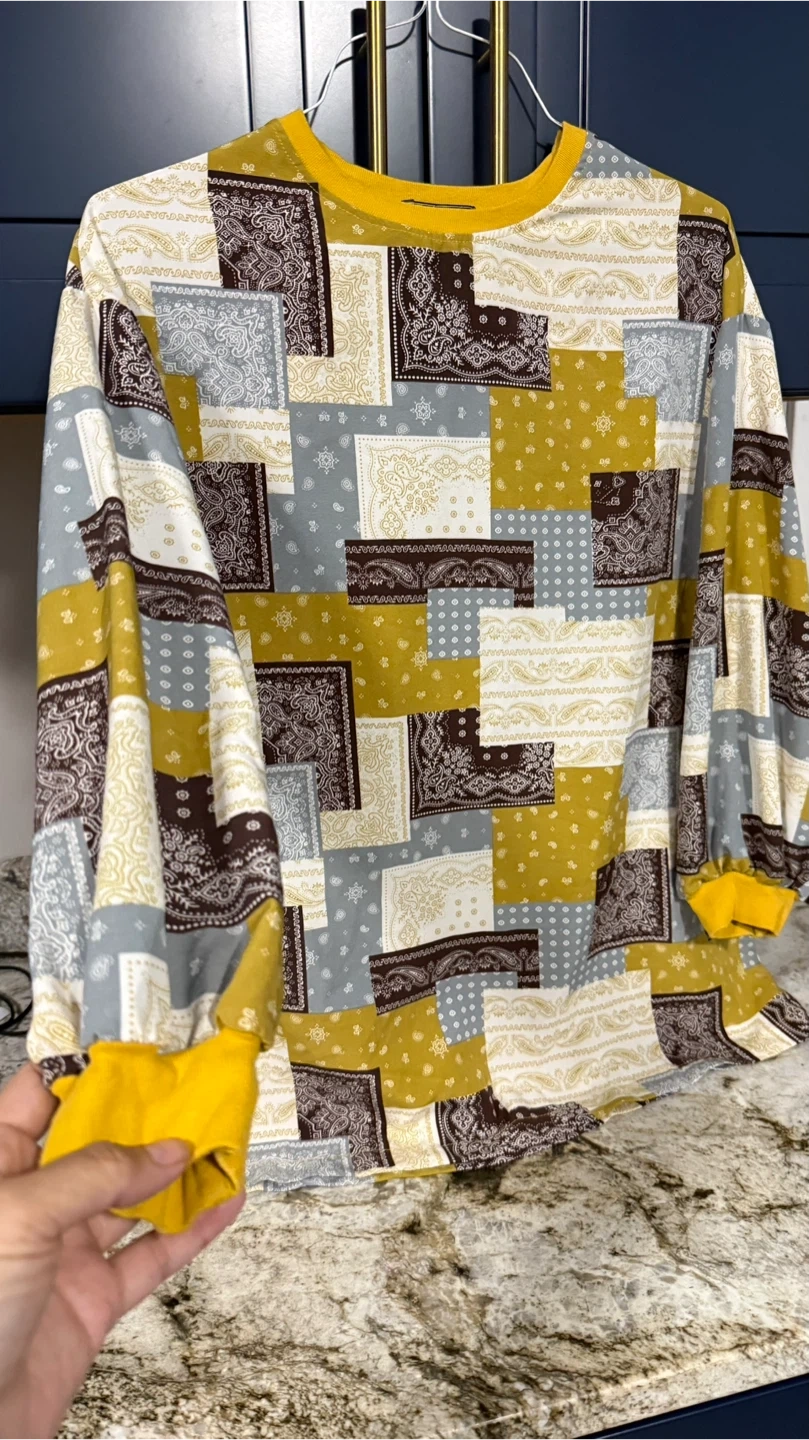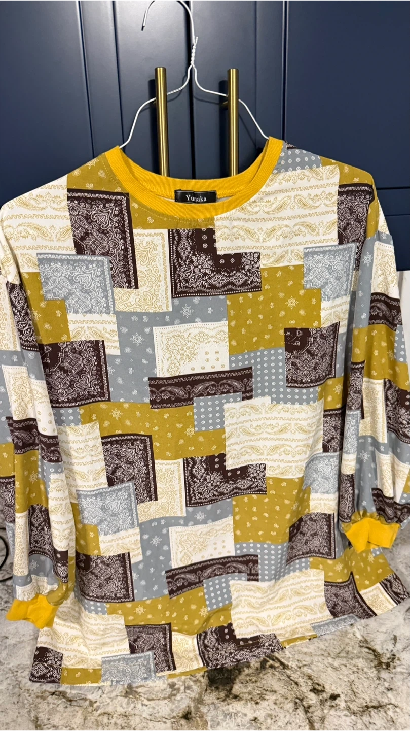 Here's a fun and stylish long sleeve top from Yusaka! It features a unique patchwork design with various patterns and colors. The top has a yellow ribbed collar and cuffs, adding a pop of color. It's perfect for adding a touch of personality to your wardrobe!