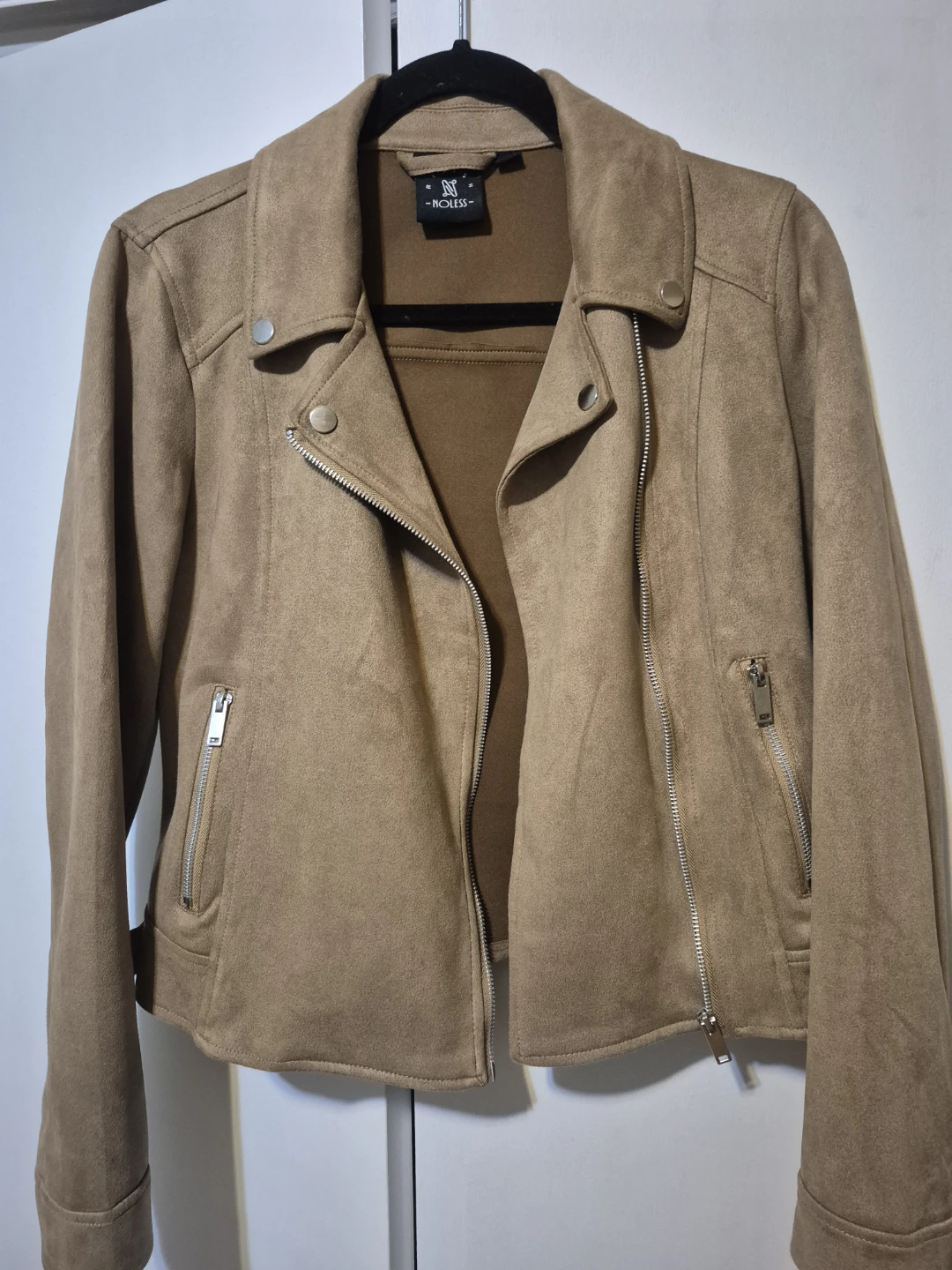 Selling a NoLess moto jacket in a beautiful faux suede material. It's in great condition and features a stylish asymmetrical zipper and silver hardware. Perfect for layering!