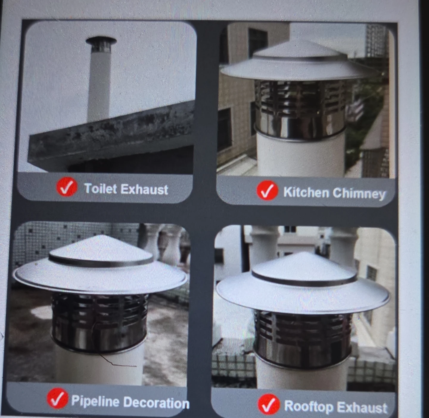 Suitable for Chimney pipes, Toilet Exhaust , Kitchen Chimneys, Pipe Decoration,Rooftop Exhaust etc.