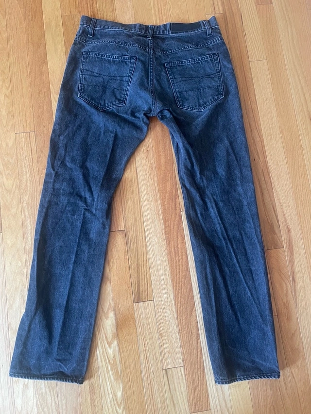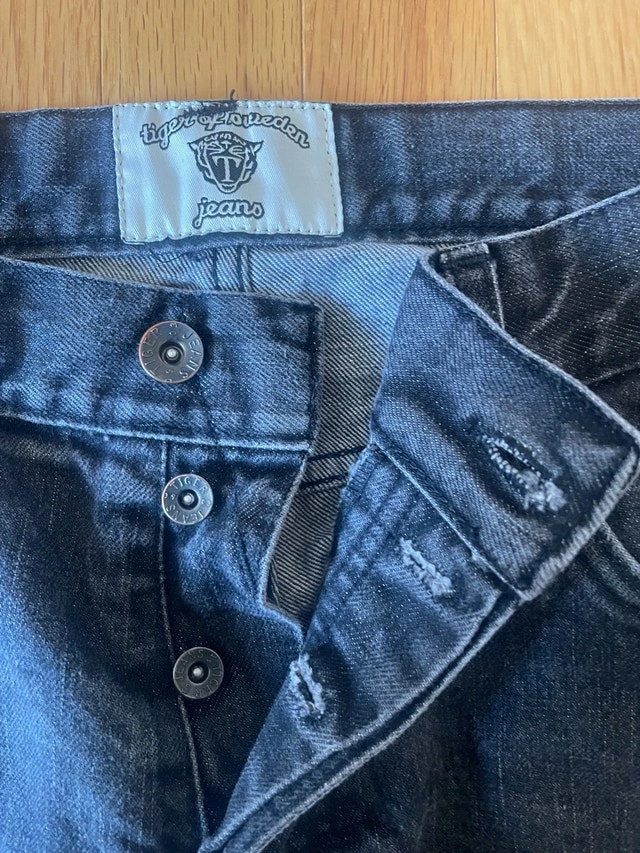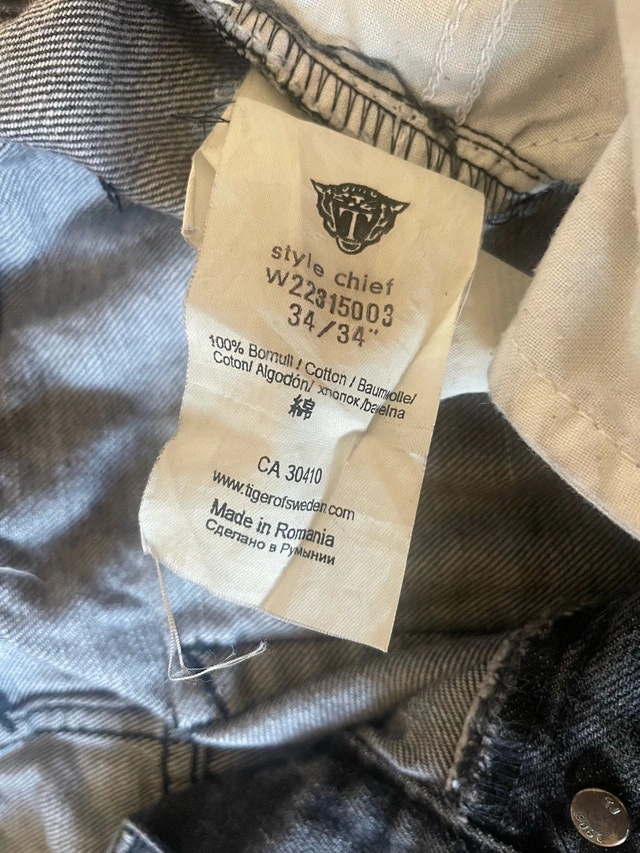 Tiger of Sweden jeans in size 34/34. These jeans feature a button-up fly and a sleek, black wash. Here are some details about the jeans: