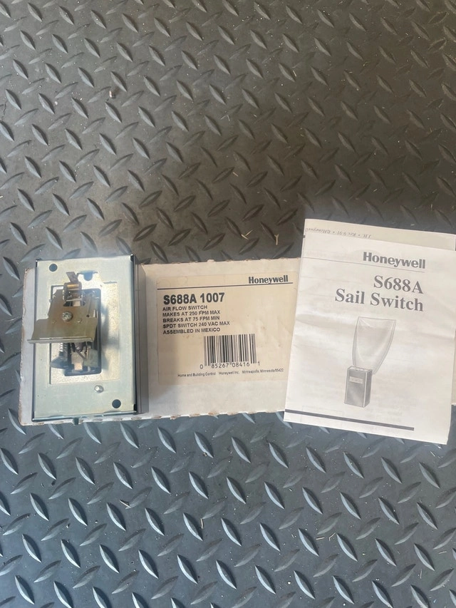Brand new switch. Simplified installations with multi-speed fans, in- accessible air handlers, fan motors with voltage or phase different from controlled equipment; eliminated wiring to system fan. Polyester film sail mounted on a micro switch snap switch. Removable spring counterbalances sail to allow mounting in either vertical (up or down) or horizontal air flow. Low air velocity switch operation makes at 250 fpm and breaks at 75 fpm.