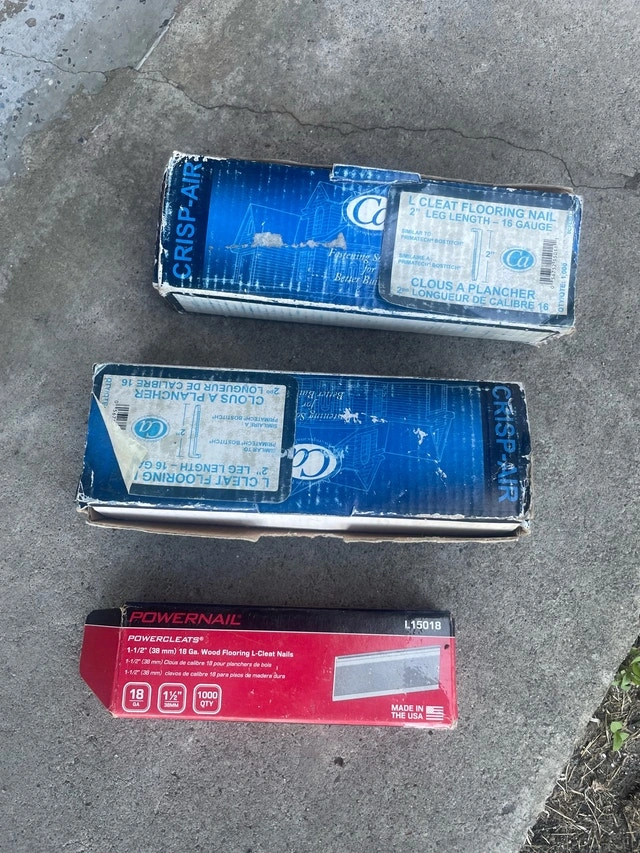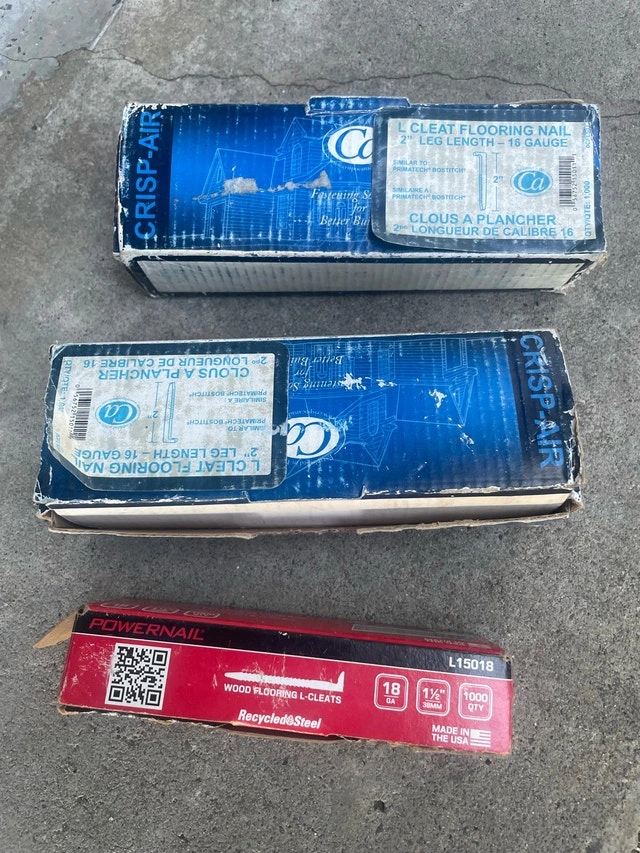 The first two boxes are Crisp-Air 2" L Cleat Flooring Nails, 16 Gauge, third box is POWERNAIL 1-1/2" 18 Ga. Wood Flooring L-Cleats. If the ad is up, the item is available.