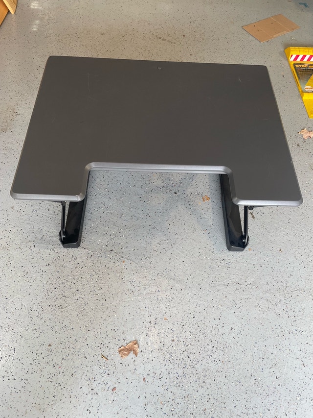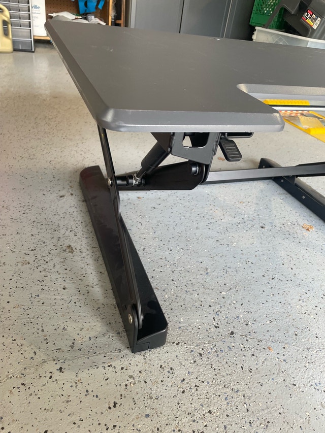 Elevate your workspace with this used adjustable height desk converter! This ergonomic workstation is designed to sit on top of your existing desk, instantly transforming it into a standing desk, and includes a keyboard tray. Specifications: Surface: 31” x 23” Height adjustment from desktop to 20” higher * Adjustable Height: Yes * Keyboard Tray: Included