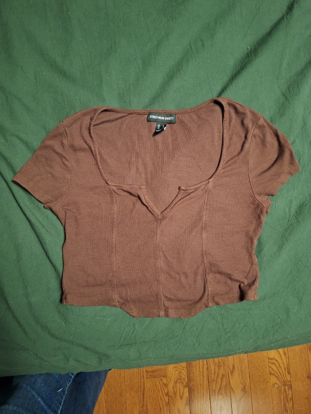 Selling a Streetwear Society top in a lovely brown colour. It's a size M, so it's perfect for a comfy fit! The material is soft and has a ribbed texture. It's super flattering because of the shape at the bottom and makes everything pop!