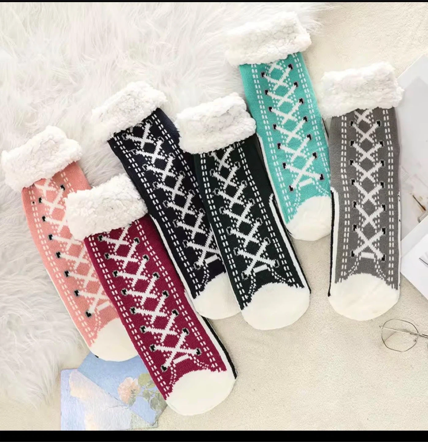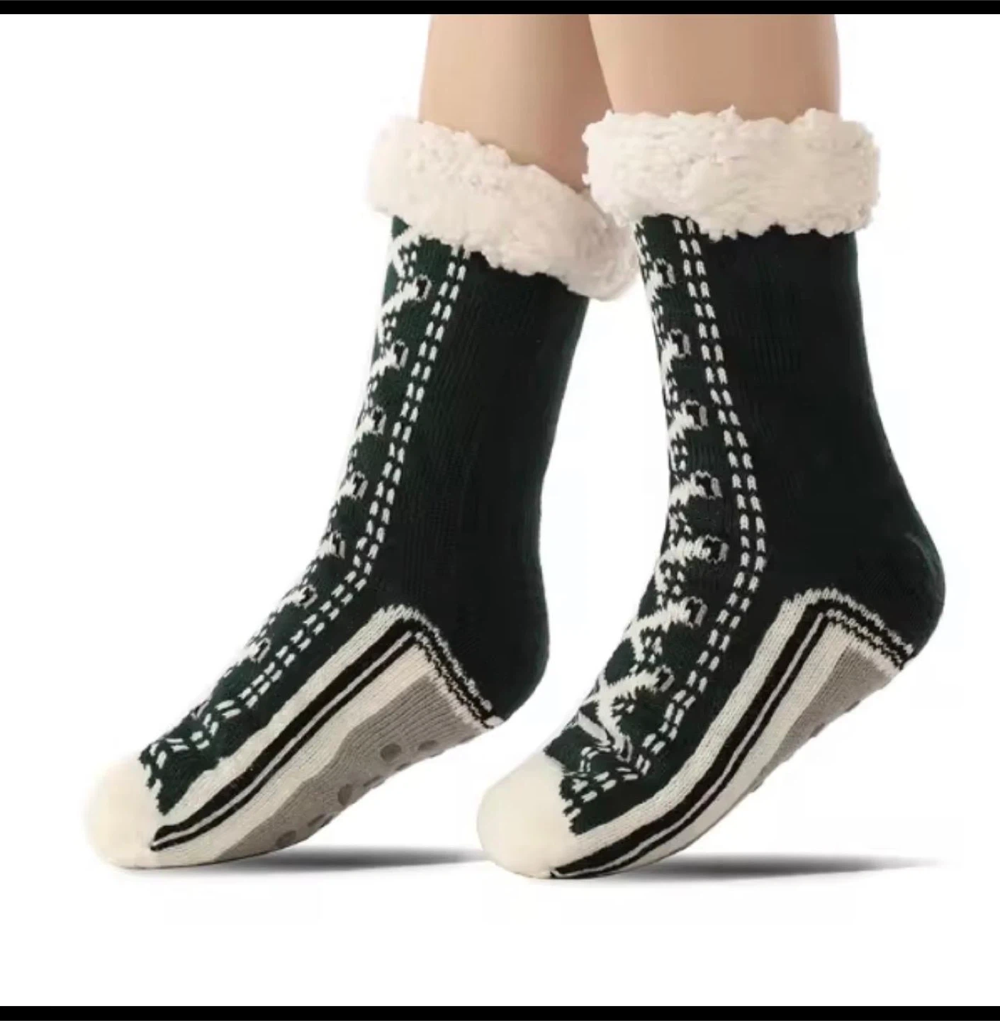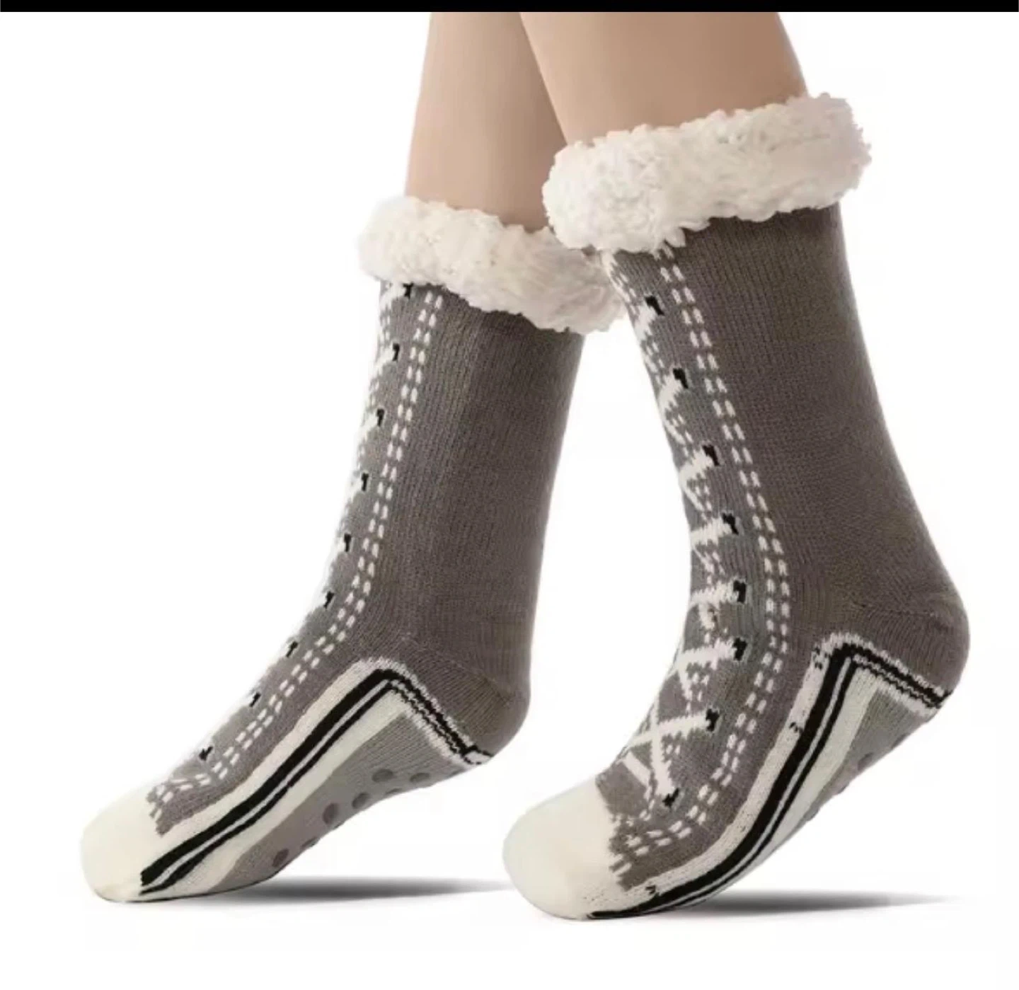 Get ready for winter with these cozy sherpa-lined slipper socks! They come in various colors and designs. Perfect for keeping your feet warm and comfortable around the house