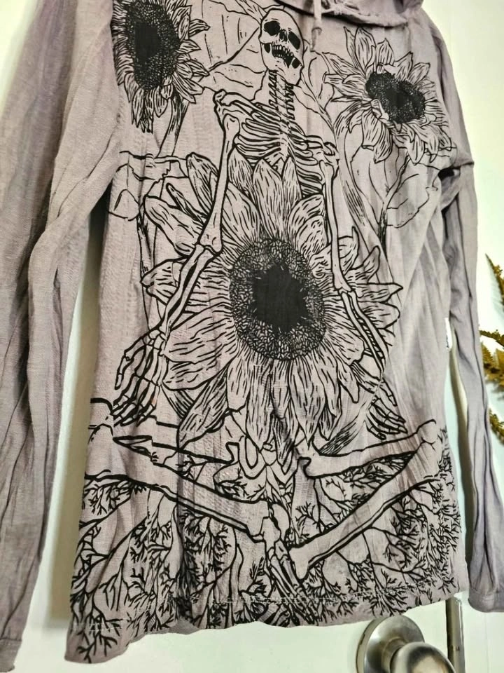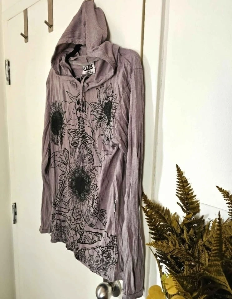 Brand new without tags hooded long sleeve top from Sure Design, an indie clothing brand based in Thailand. Lightweight and breathable crinkled 100% cotton shirt with a psychedelic/ spiritual print of a meditating skeleton surrounded by sunflowers. Shirt was only tried on and never worn.