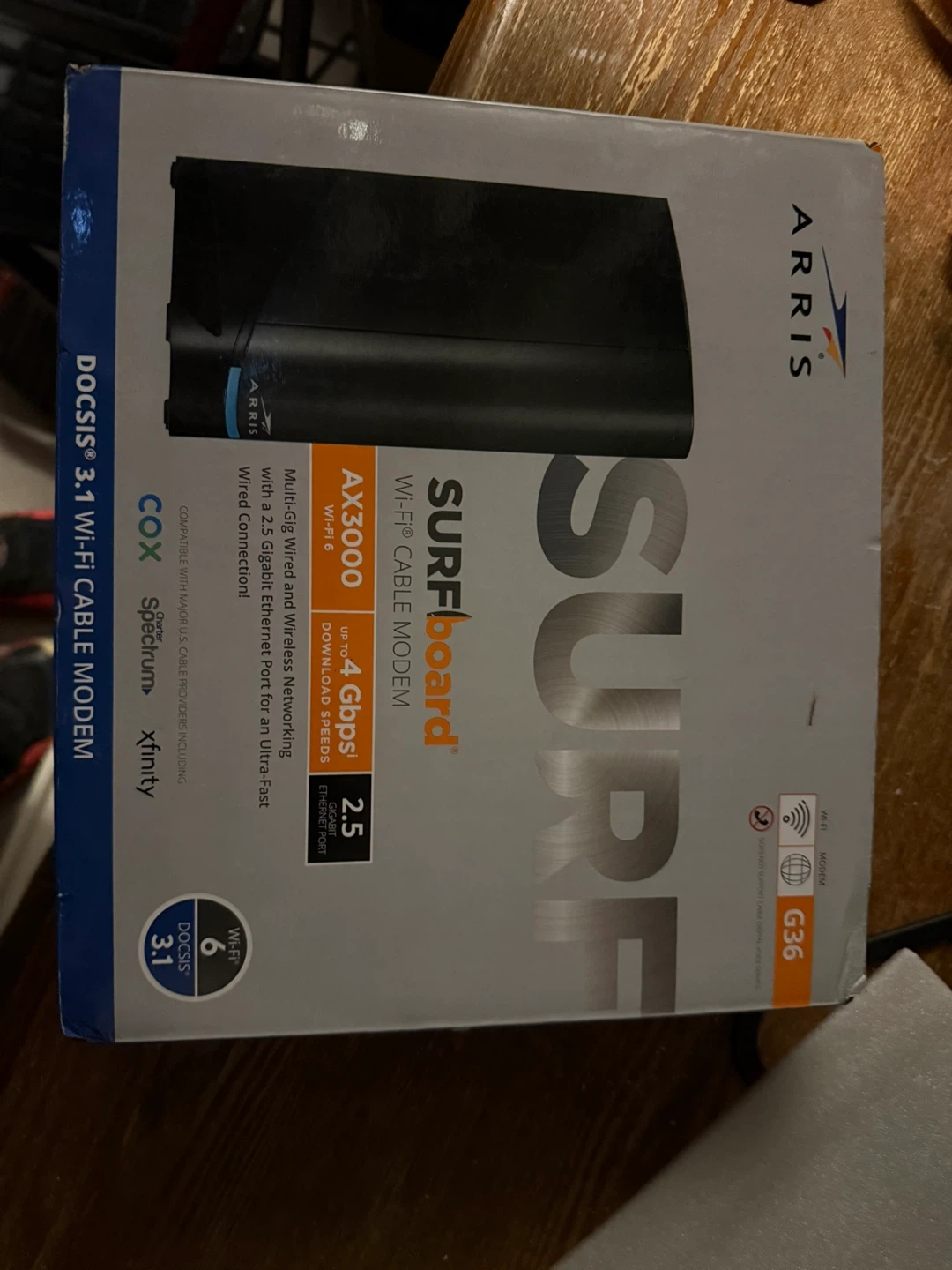 Selling an Arris SURFboard AX3000 Wi-Fi cable modem, model G36. It's compatible with major U.S. cable providers including Cox, Spectrum, and Xfinity. It features multi-gig wired and wireless networking with a 2.5 Gigabit Ethernet port for an ultra-fast wired connection. Also, it supports Wi-Fi 6.