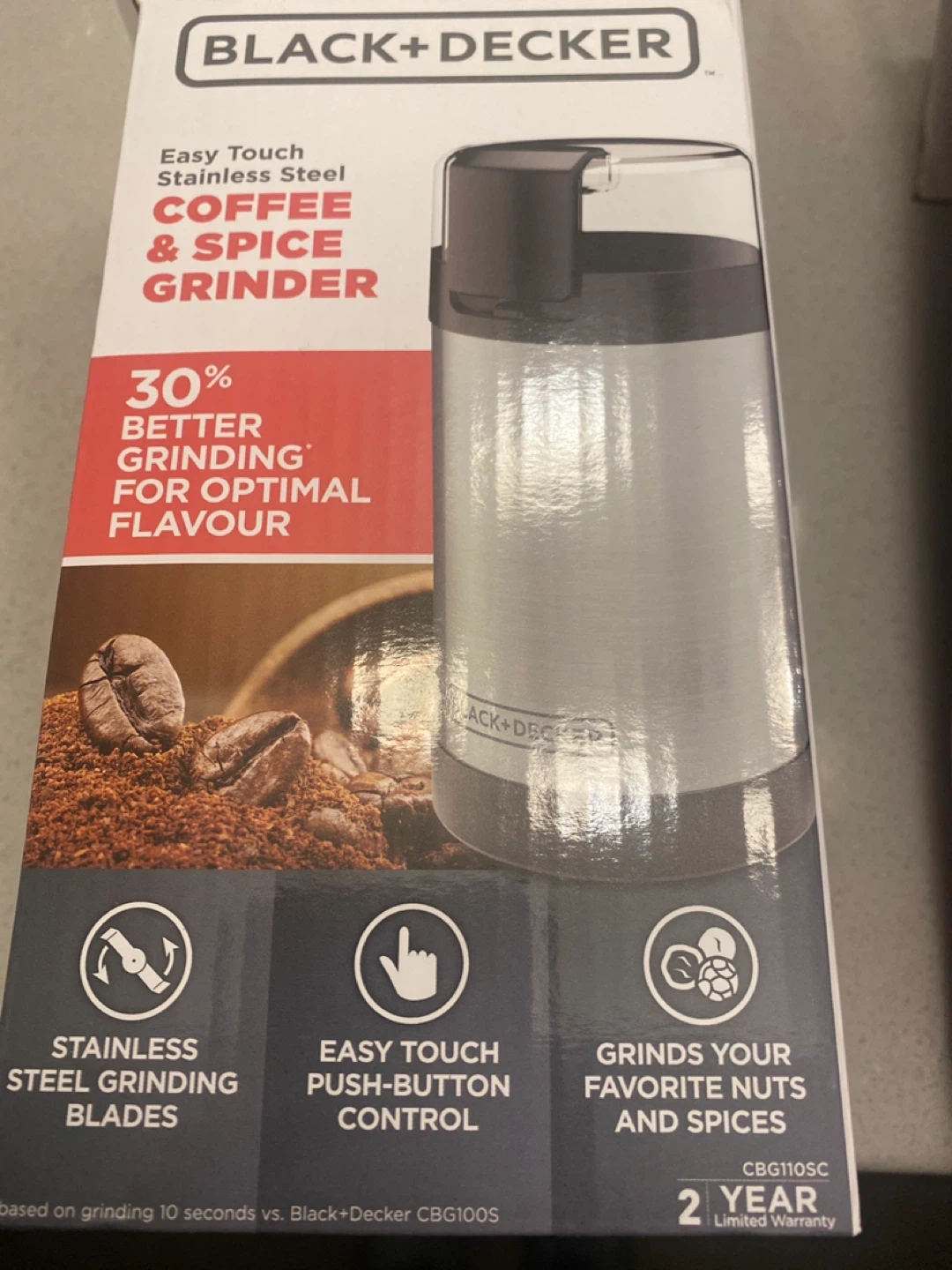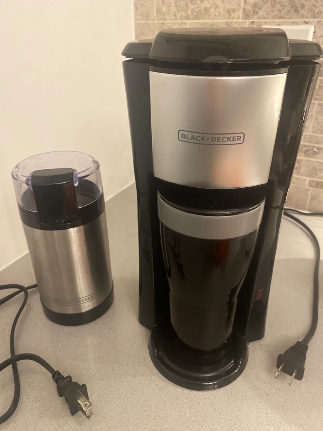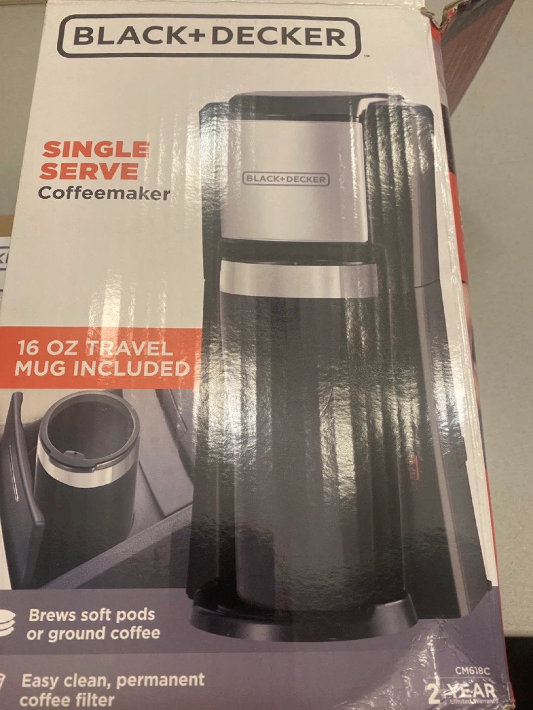 Selling a Black+Decker single-serve coffee maker that brews soft pods or ground coffee. It includes a 16 oz travel mug. Also included is a Black+Decker easy-touch stainless steel coffee cup and coffee bean & spice grinder. It features stainless steel grinding blades and easy push-button control.