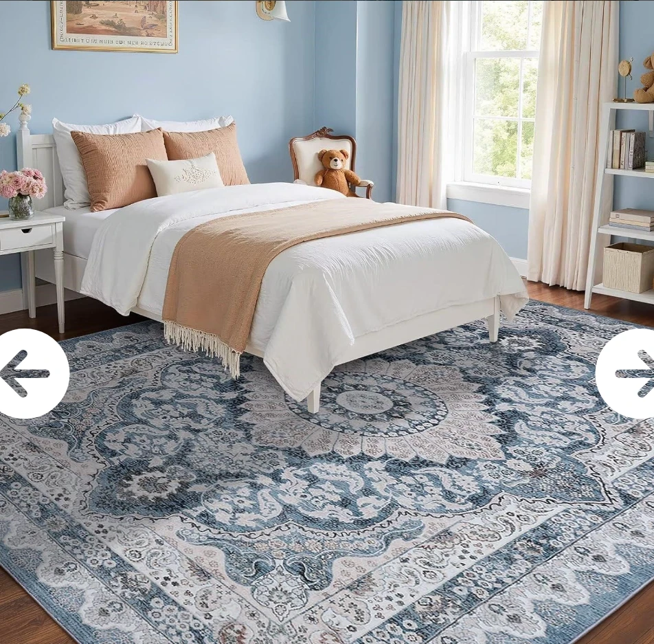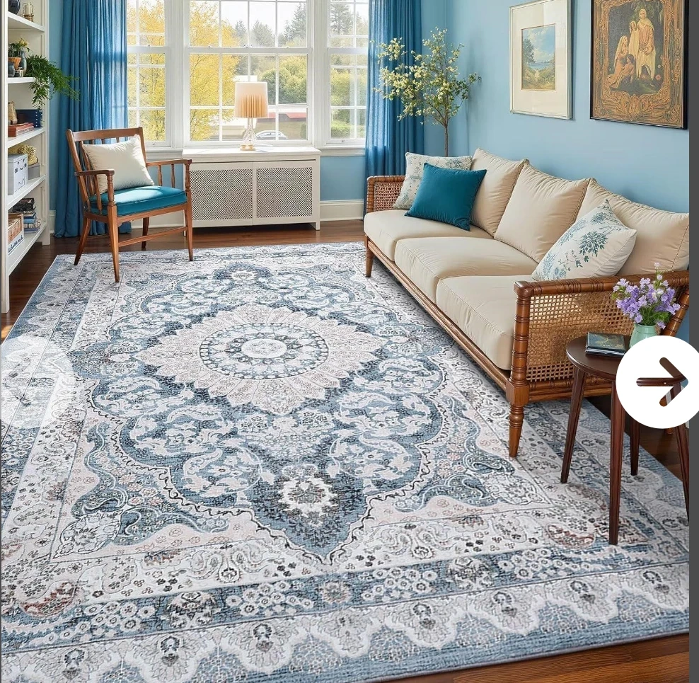 8x10 Area Rug for Bedroom, Machine Washable Rugs with Non-Slip Backing for Living Room, Large Vintage Carpet Kitchen Laundry Kids Room Decor, Blue & Beige