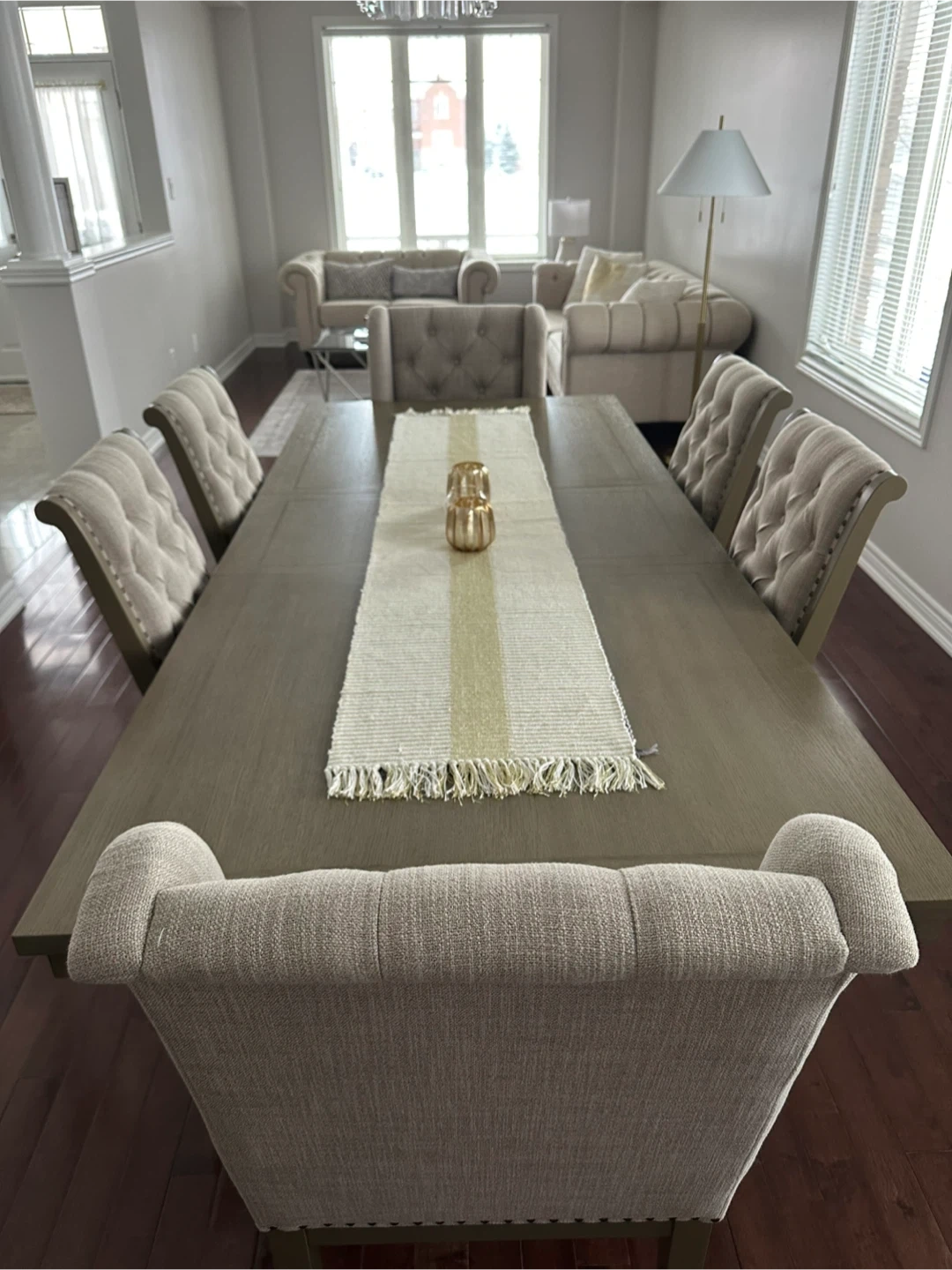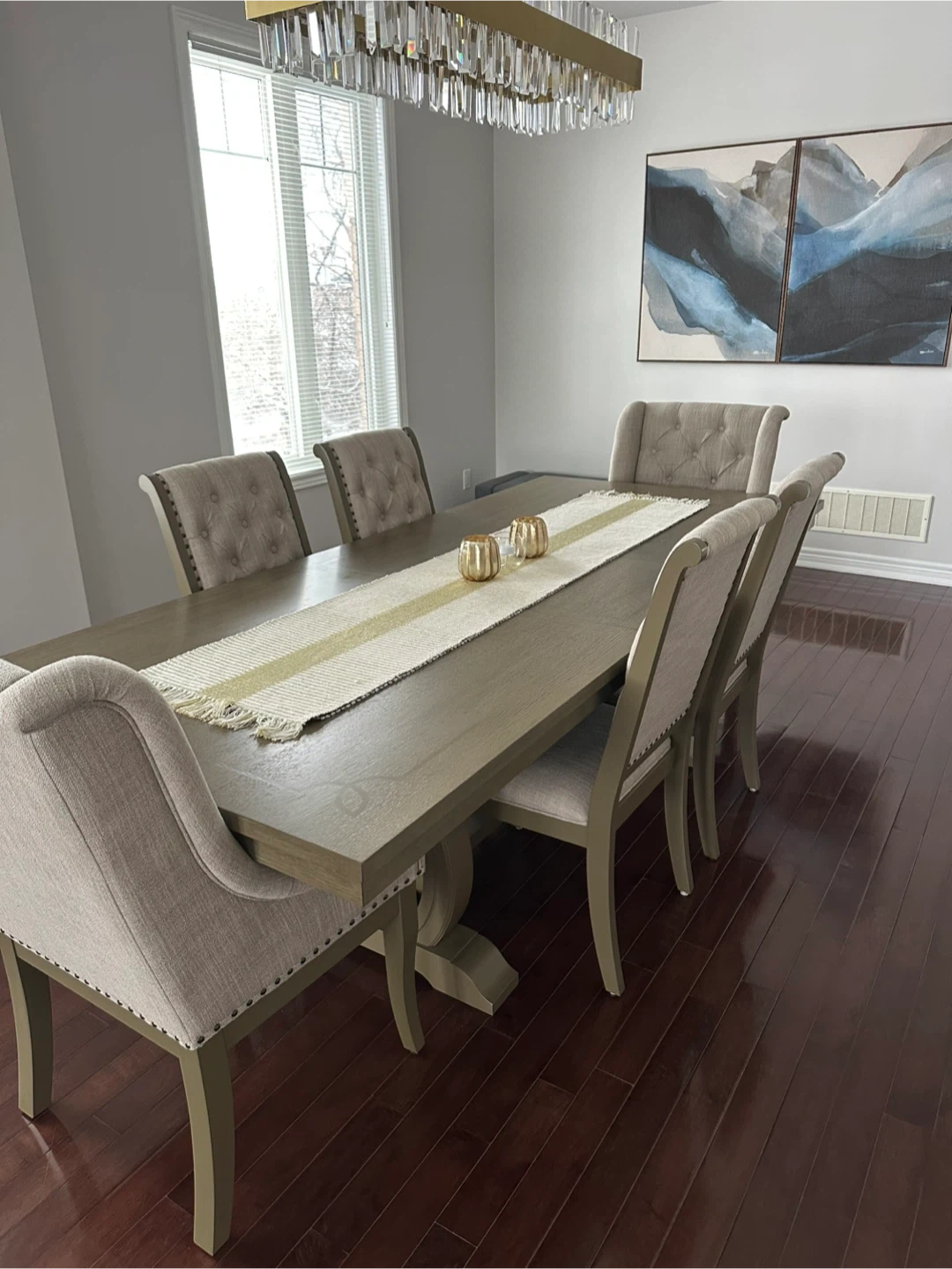 Selling a dining table with six chairs. It's in great condition and would be a lovely addition to any home. The chairs are upholstered with a button-tufted back.