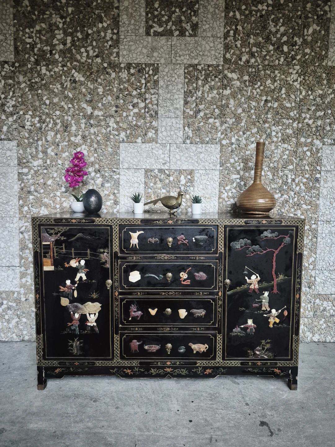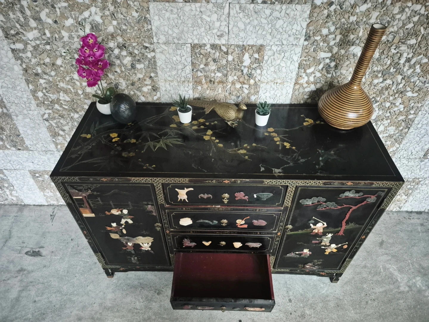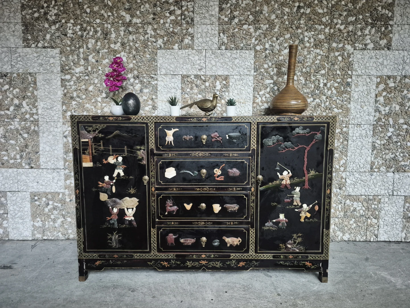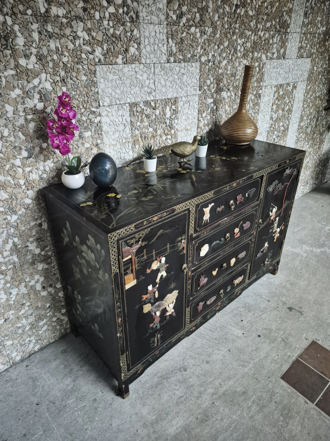 Vintage Chinese Black Lacquer Sideboard with Hardstone Inlays