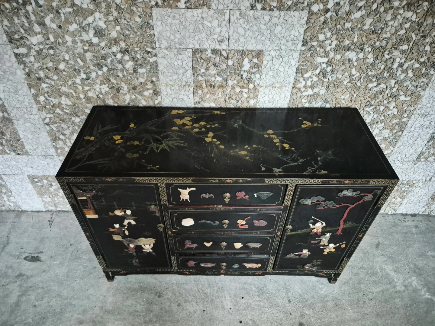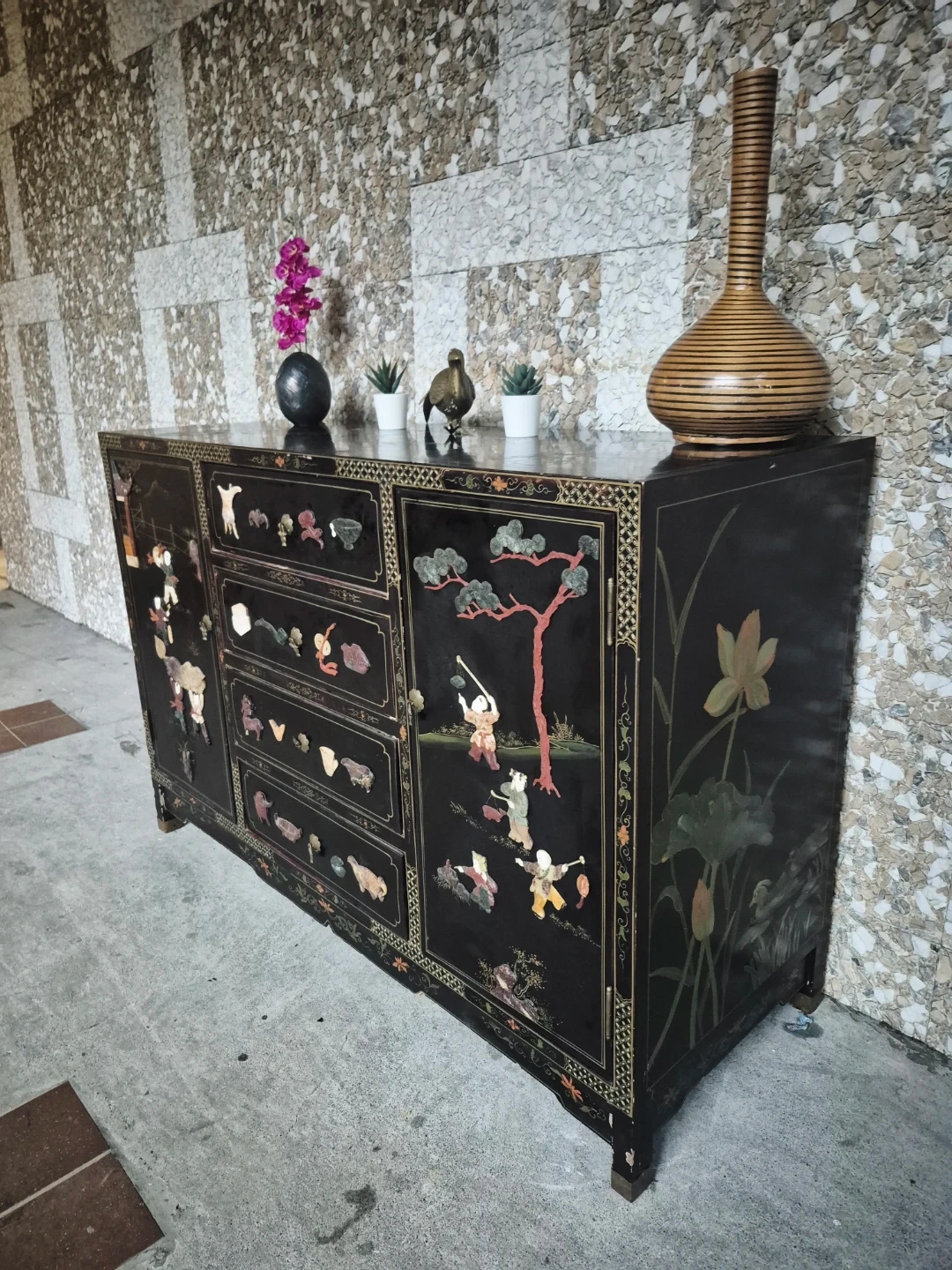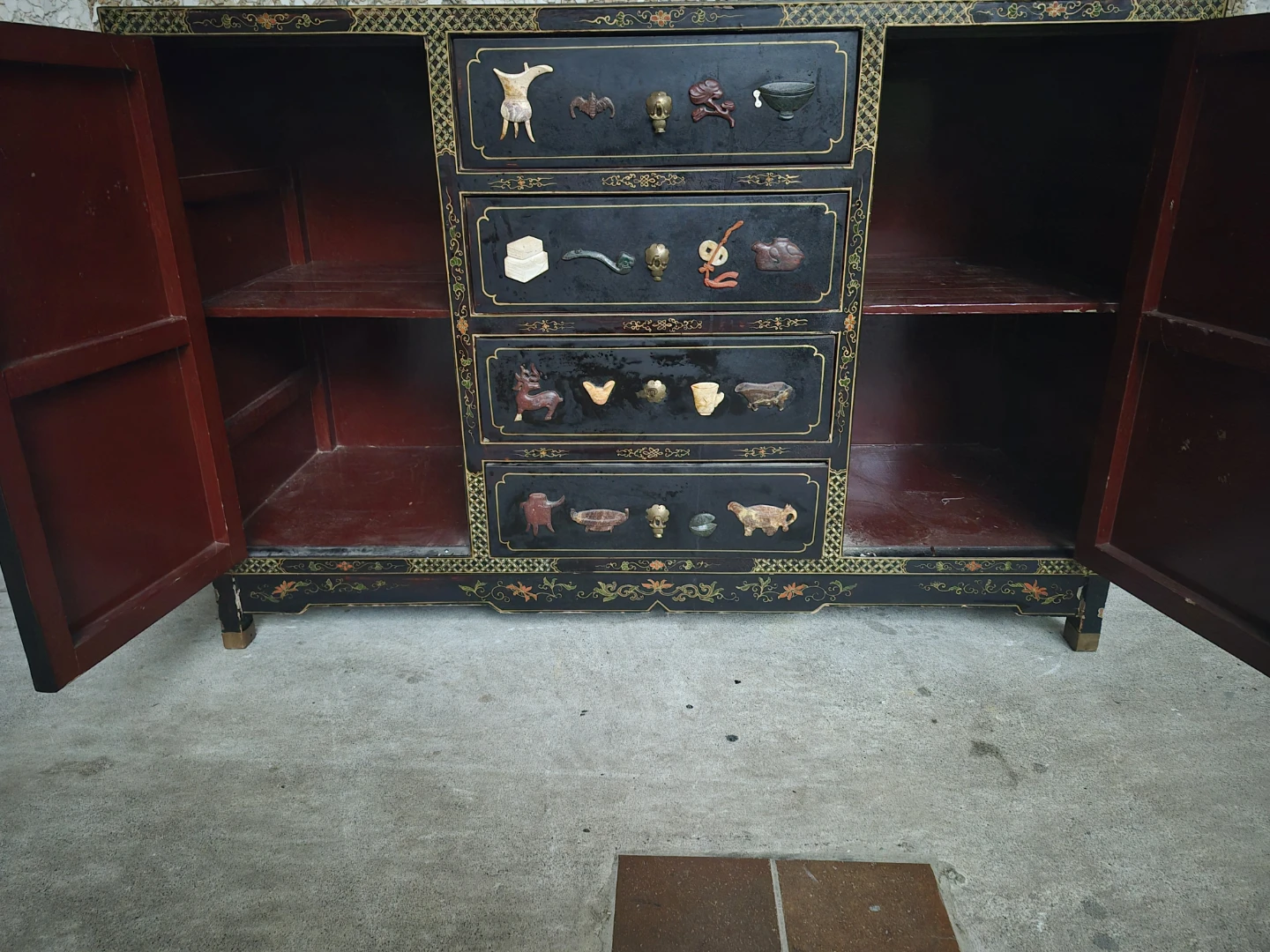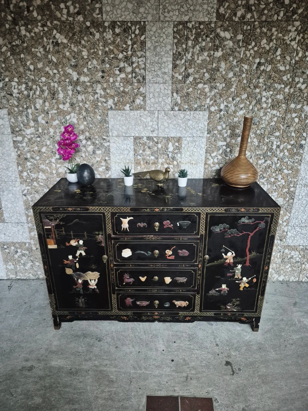 Vintage Chinese Black Lacquer Sideboard with Hardstone Inlays