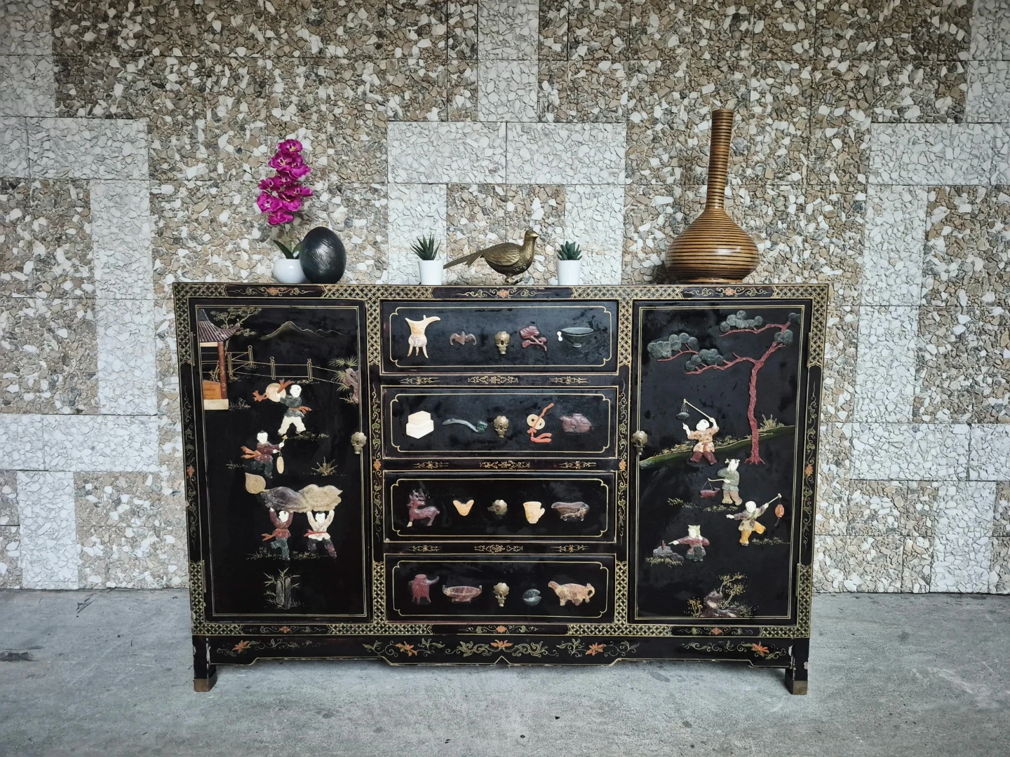 Tags: Vintage Furniture Antique Cabinet Chinoiserie Asian Furniture Chinese Lacquer Black Lacquer Furniture Mid Century Asian Hollywood Regency Oriental Decor Hardstone Inlay Soapstone Inlay Jade Inlay Furniture Raised Relief Cabinet Hand Painted Lacquer Scholar Objects Motif Children Playing Scene Zodiac Animals Decor Sideboard Credenza Buffet Cabinet Entryway Console Media Console TV Stand Storage Cabinet Display Cabinet Vintage Chinese Export 1960s Furniture 1970s Asian Cabinet Retro Chinoiserie Good Vintage Condition Chinese Export Furniture Lacquered Wood Cabinet Traditional Chinese Decor Eclectic Home Decor Statement Piece Furniture