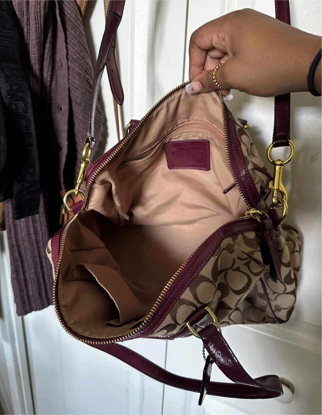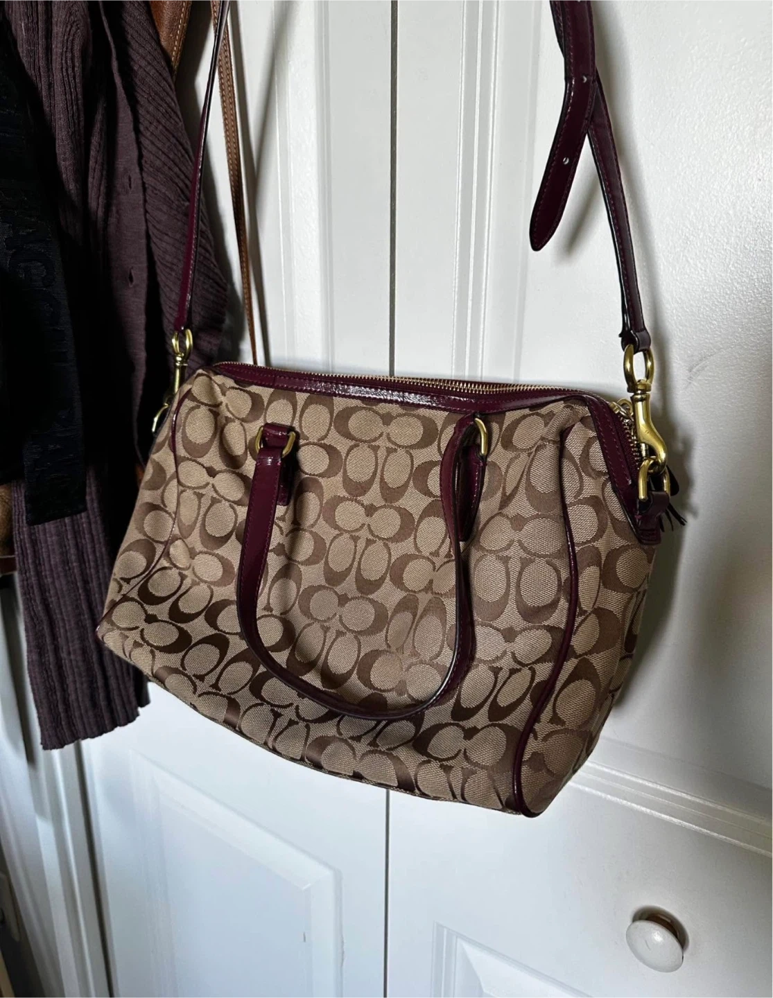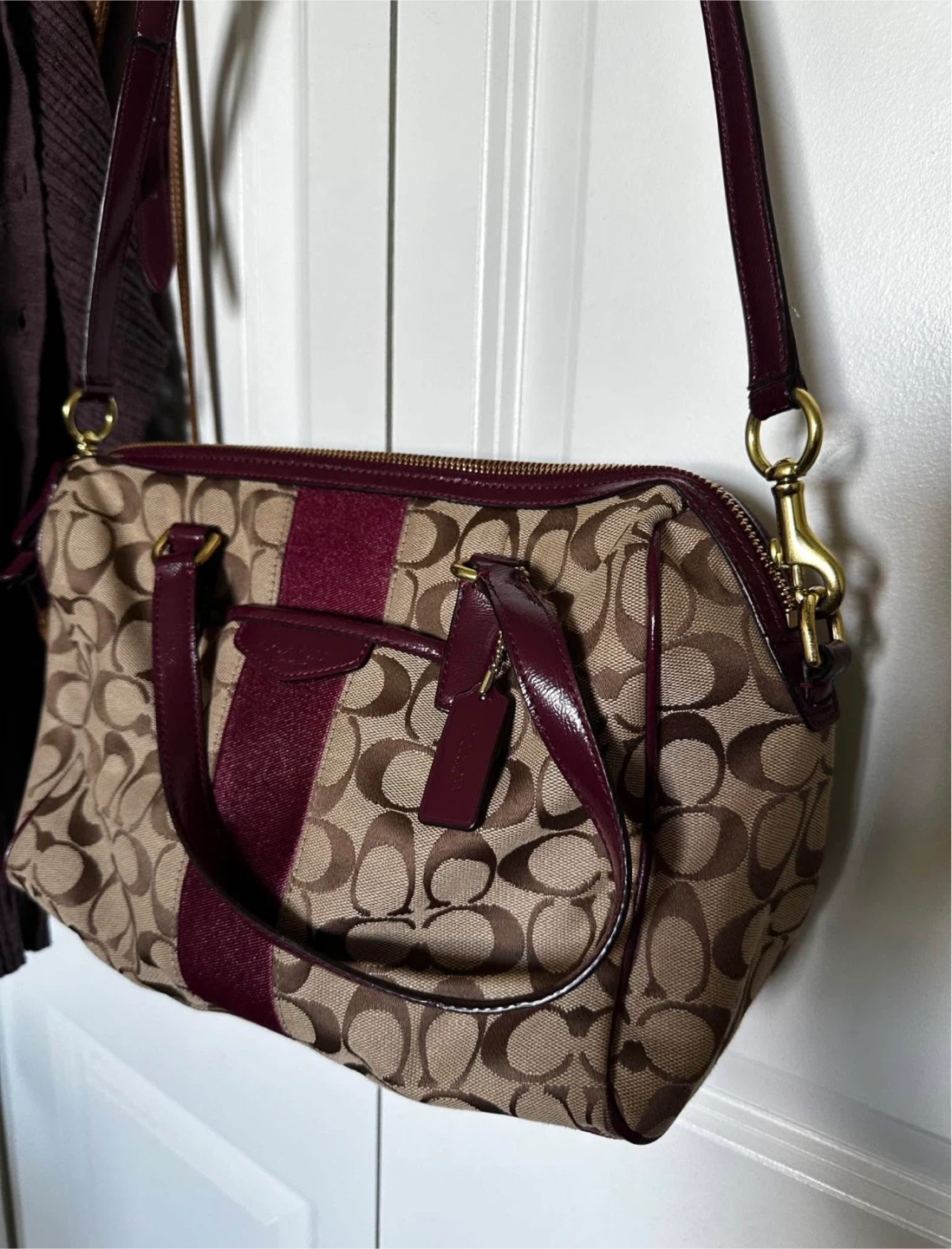 Selling a Coach satchel bag with the signature Coach logo pattern. It's in great condition and features a burgundy stripe detail. Perfect for everyday use!