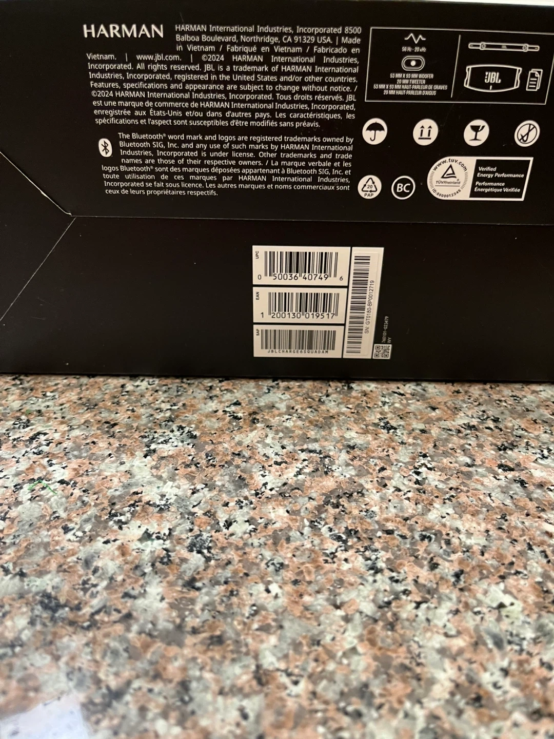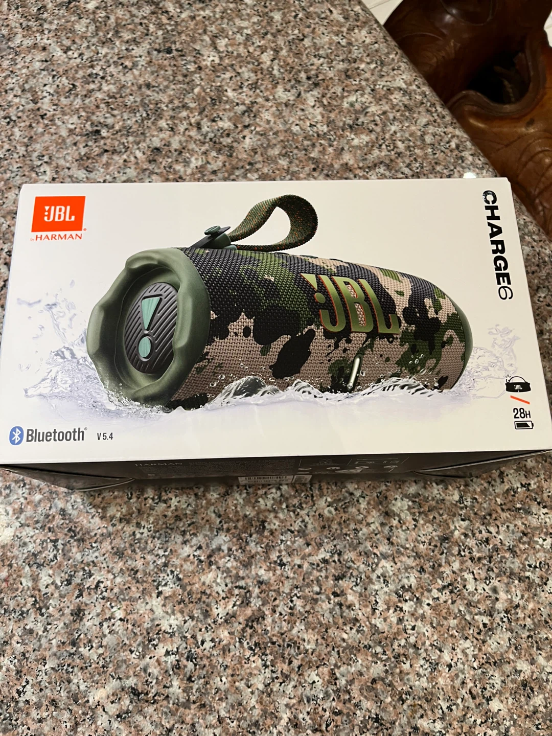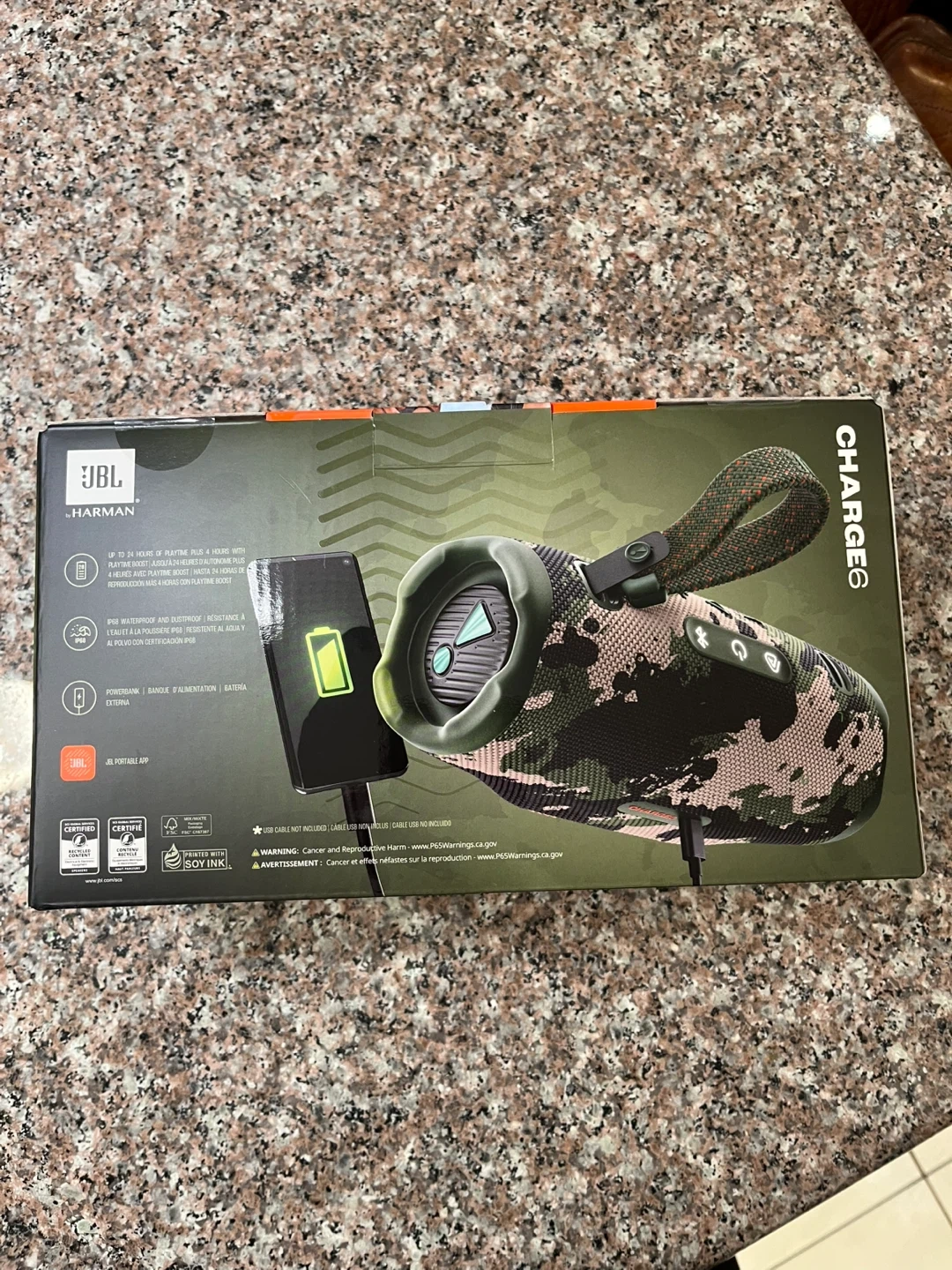 Selling a brand new JBL Charge 6 portable Bluetooth speaker in its original packaging! This speaker is perfect for on-the-go listening with up to 20 hours of playtime. It's waterproof and dustproof, making it ideal for outdoor adventures. The box includes the USB cable for charging. Won as door prize at Christmas work party.