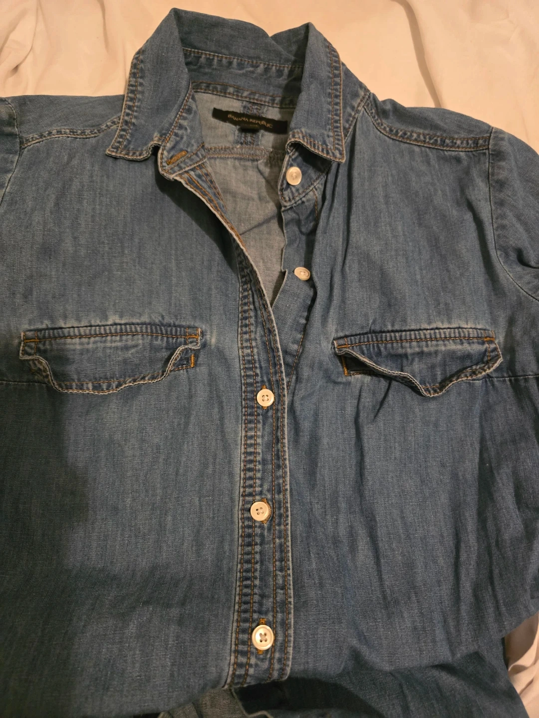 Selling a Banana Republic denim shirt dress in size XS. It's a light wash denim with button-down styling and two chest pockets. Great for casual wear!