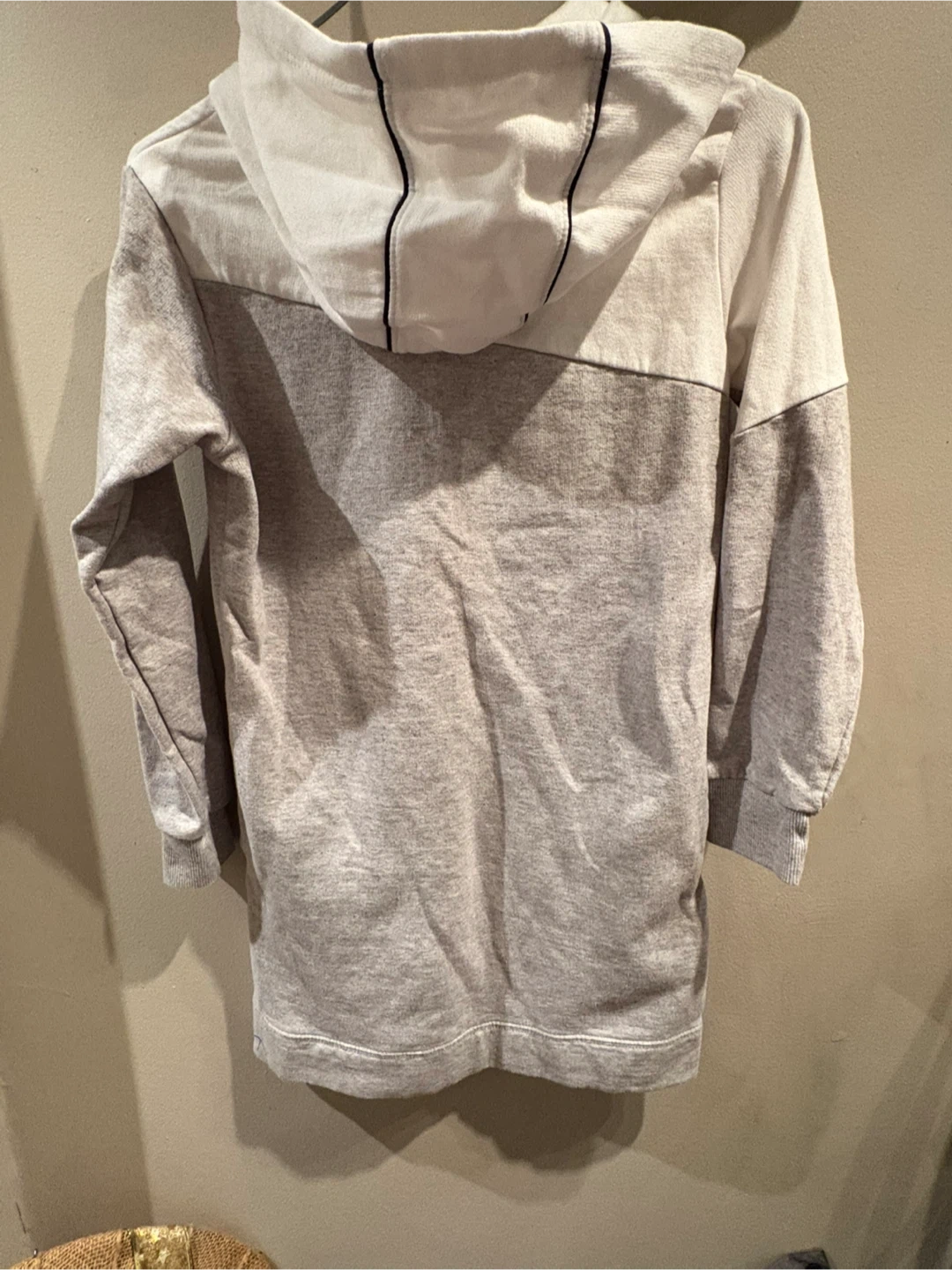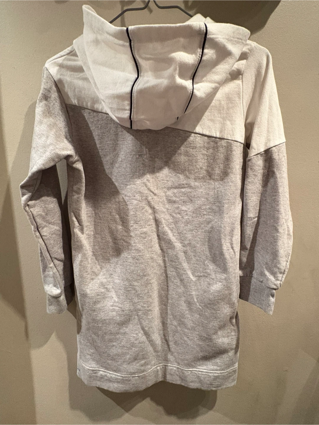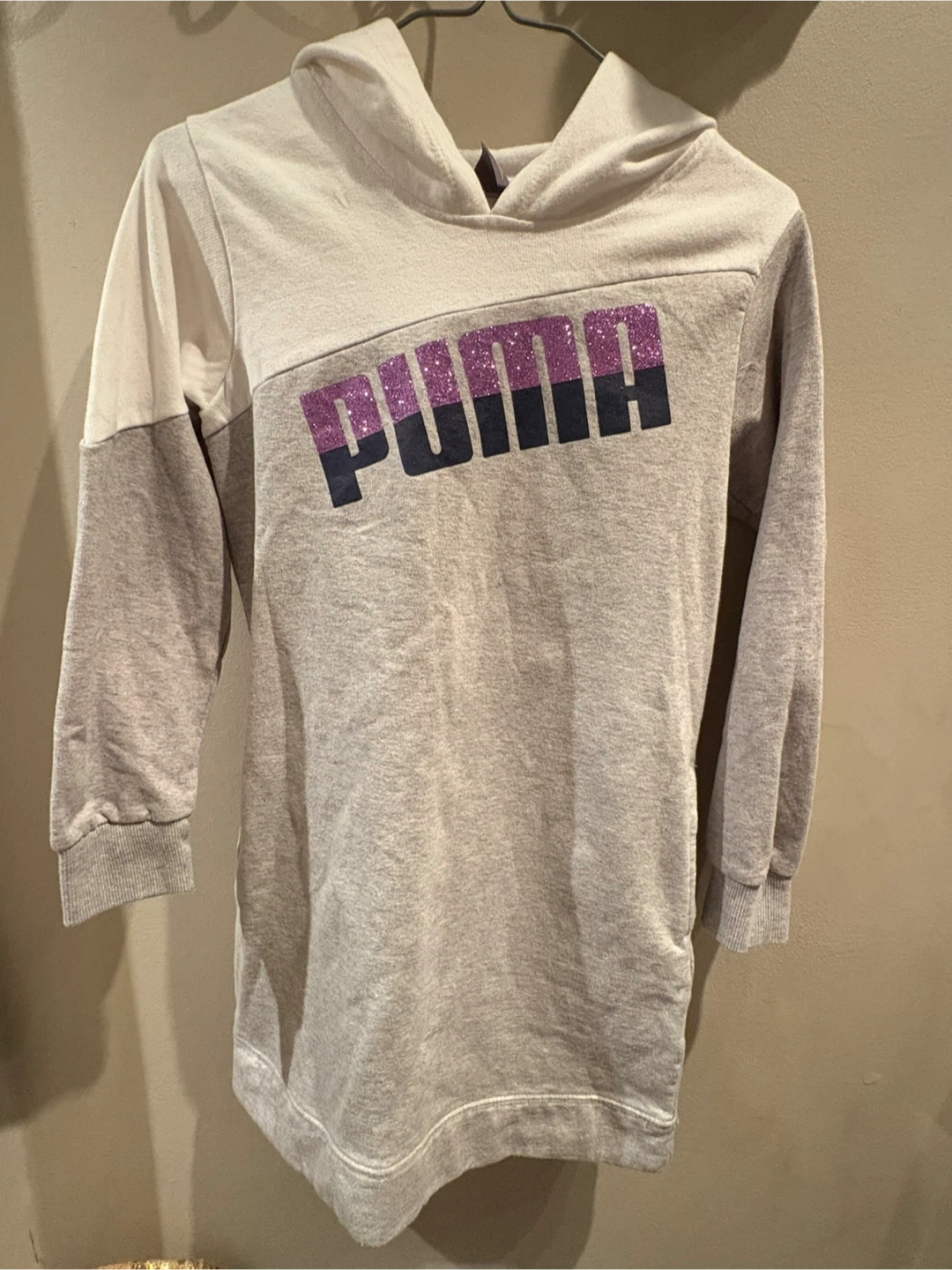 Selling a cute Puma hoodie dress in shades of grey and white. It's perfect for casual wear and super comfy! The Puma logo is featured in a glittery purple and black. Youth girls size 12-14