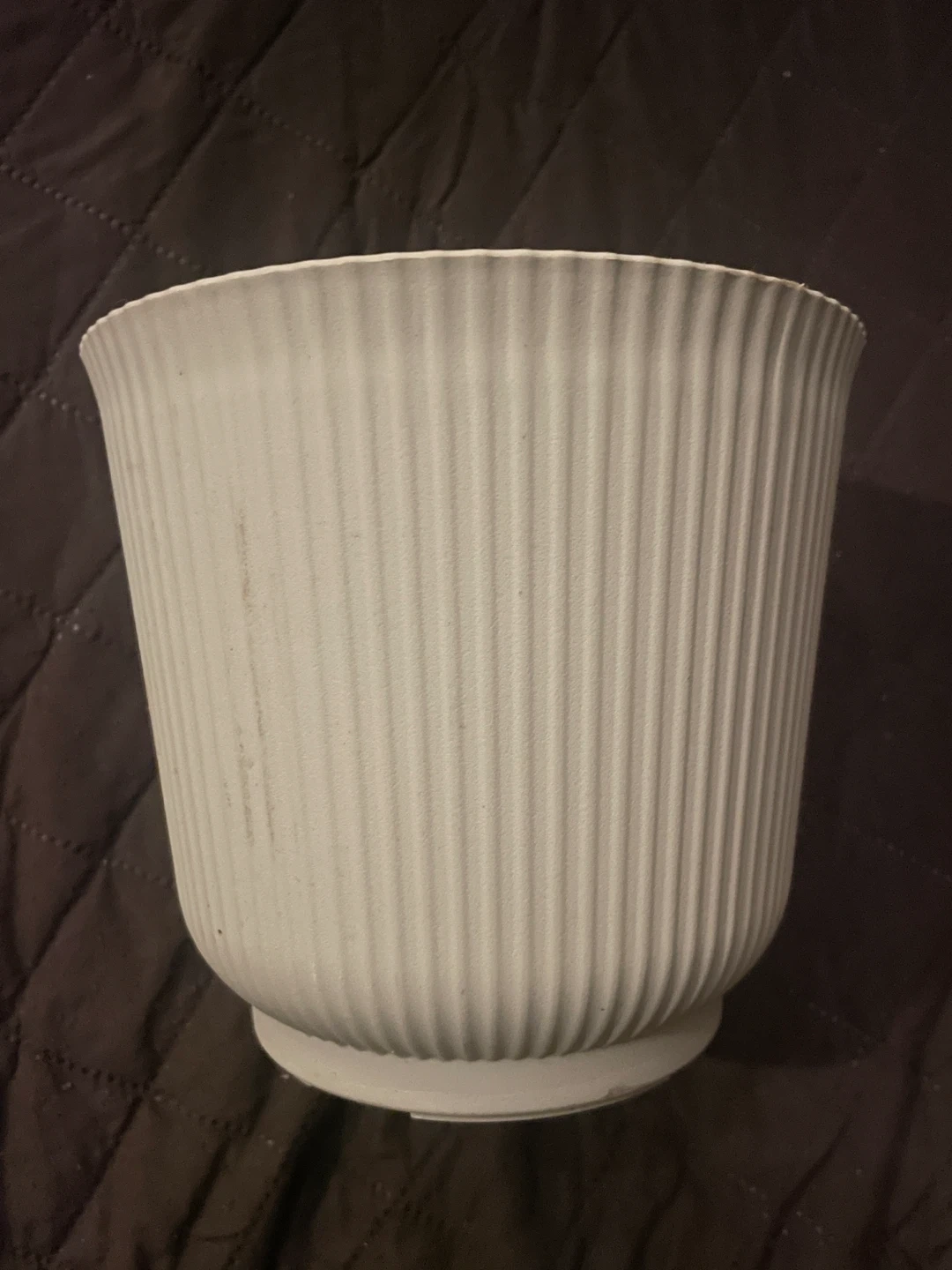Selling a simple light green plant pot! It has a ribbed texture and a classic design that would look great with any plant. It's in good condition and ready to add some greenery to your space.