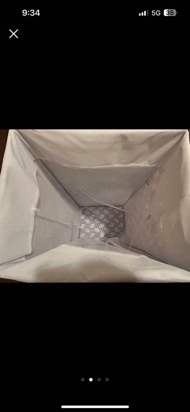 Grey and white chevron patterned laundry hamper. Removable washable liner bag. Includes lid. Great for bedroom or dorm room. Approximately 18"W x 13"D x 22.3"H.